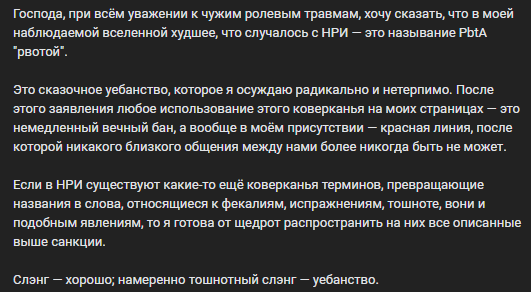 >>1627112 Слееров маркировать убийцами норм, потому что близкого аналога в простом русском нет, а дальше в тексте кодекса раскрывалось (лет 20 назад, по крайней мере), что это зашквареный отморозок-социопат с мутным прошлым и далее. А вот хуйнуть что-нибудь типа УЙБИФЦЫ или ТУШЕГУБИНЫ это да, сразу чуешь отечесного кализатора из офецеальных