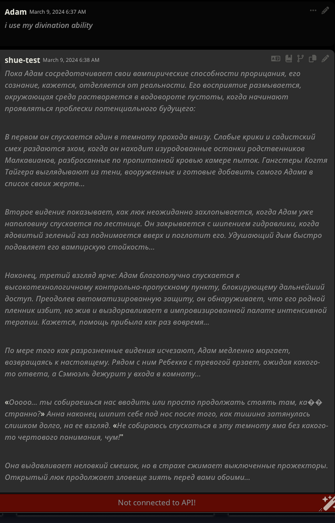 Я сделал сценарий для нейросети где отыгрываю шуе-малкавиана общающегося с камнем и несколькими головами в голове, но в сеттинге киберпука 2077. К сожалению попытки реализовать сеттинг wod на нейронке полностью провалились из-за сложности механик и галлюцинаций нейронки (генерация не-лорного контента). Но лет через 5 думаю шизы, у которых нет друзей смогут полноценно игрунькать.