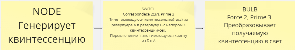 >>1632003 >изменение параметров эффекта Не было ни слова про это. Лампочка- один объект, с одним эффектом- преобразование поступающей квинтессенции в свет. Квинта есть- есть и свет, квинты нет- света тоже нет Триггер (выключатель)- другой объект, тоже с одним эффектом (но другим)- тянуть квинту из точки А в точку Б. Есть квинта? Тянет. Нет квинты? Тянет ноль квинты.