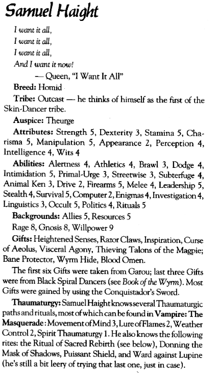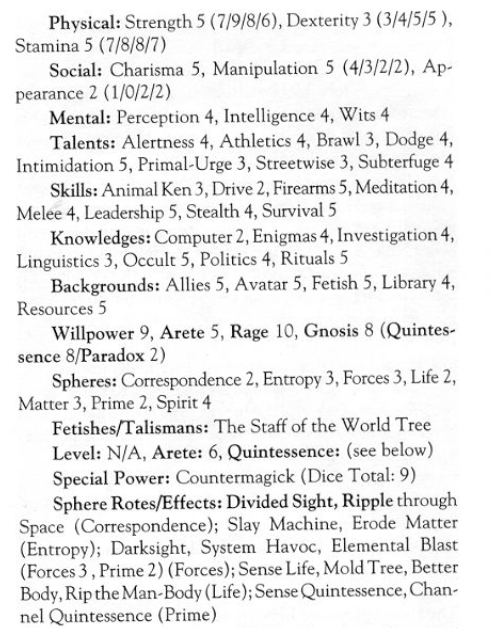 >>1632620 Странно это. Палку он корчует себе в пятой сцене в Book of Chantries и там как нпс он уже расписан с Аватаром 5, эссенцией, Арете и сферами, и мастеру говорится, что у него есть дары оборотней, но чтобы лишний раз не лазить по книгам рекомендуется делать так, что он пользуется не ими или таумой, а сферами.
