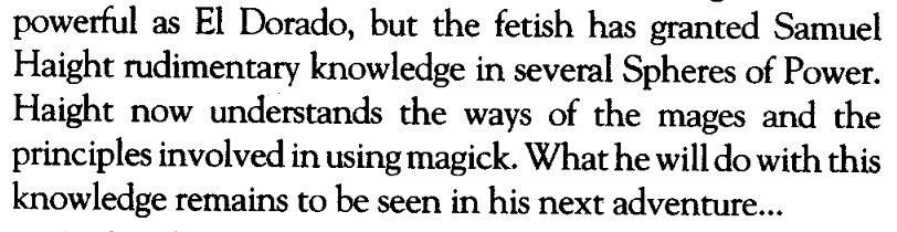 Entropy ••••• • Stasis and Chaos Mage can put things to their ultimate annihilation - or to preserve them in absolute stasis. Now, any damaging effect caused by him can be aggravated and effects of such nature are considered to have maximum soak difficulty (or cannot be soaked at all) as possible - like sunlight for a vampire or silver for garou. On other hand mage can easily mend aggravated damage with the same ease as if it was bashing - including natural healing of mage himself. Also patterns can be hardened by archmaster to impossible levels, so they are looked like they are immune to the flow of time, but for the same duration they are forbidden to any existential changes (for example a human can be made naturally immortal, but he will be barely able to memorize anything new during this existence. Addition of high levels of other spheres can probably mitigate such drawbacks). ••••• •• Ultimate Destiny Mage is always considered to have a Destiny merit with a rating equal to the rating of his Entropy sphere. Nature of such Destiny depends on what exactly mage wants in this exact moment and can be anything and changed on whim to match his wishes. Also he freely perceives other such merits and knows their natures. He can create, destroy or alter alter such merits in ease, for 1 success and 10 points of Quintessence per dot affected (this is an effect of Entropy 5 for mechanical purposes). ••••• ••• Entropy Shielding From now on mage can be willingly immune to any natural decaying or entropy effects or anything related to them. He can decide whether he will become thirsty or will he age today, will blood flow from his wound or will his voice disperse in the distance etc. Now mage can be injured only by brutal direct force - consider him immune to anything but direct aggravated damage (except when he is willing otherwise). ••••• •••• Quantum Will From now on, anything around happens in a way a mage wills it. It's simple - any dice roll related to mage or known by him shows results that he selects. He can't direct others actions in such a way, but when it comes to outcomes - he names what number shows every die rolled and what and how it all happens. This power is considered coincidental to some degree - but always invokes Paradox when related to magical effects - mage gains one point per one affected die.