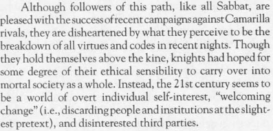 Второе, что вспоминается, это одна из финальных сцен хроники. Там ситуация была такая - с ячейкой охотников Князь приказал кончать. Котерия сперва решила, что Вентру просто пойдет к ним как к своим корешам и напудрит им мозги доминированием, чтобы они просто съебали куда-то в другой город или даже страну, но, как я выше писал, он этой способностью пользоваться решительно не хотел. Малкав и Носфер решили проблему тогда по-своему - после бандитских войн у них было немало налутанной наркоты. Ну и они эту наркоту подбросили на базу ячейки, а потом навели туда копов. Так уж вышло, что охотники не без оснований решили, что это какая-то вампирская замануха и когда их пришли задерживать с кавалерией при полном параде - оказали вооруженное сопротивление. Закончилось все очень плохо, с трупами с обоих сторон. Вентру, как узнал, очень крепко разозлился на приятелей и начал поливать их говном, но носфер даже не взял его за грудки, а приподнял за шкирку над землей одной рукой и донес до него мысль, что если бы Мистер-Весь-В-Белом не занимался хуйней, а делал как просят, то всего этого можно было бы избежать. И вообще, нехуй тут ныть, твои руки чисты - мы изгваздались вместо тебя, мог бы, блядь, и поблагодарить. На том хроника и закончилась. В эпилоге, Вентру отправился искать Голконду, Носфер остался подниматься по карьерной лестнице в домене, а Малкав начал слышать Сеть и пошел разбираться, что это за голоса в голове.