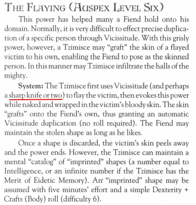 >>1632454 Альтернатива Голконде. Но если Голконда достигается через Человечность, то аджика эта - через Путь Метаморфоз и Изменчивость. Типа, вампир настолько преисполняется в своей власти над плотью, что ему становится очень похуй на много вещей и очень заебись в целом. Конкретной игромеханики не приведено, предполагается только то, что можно поднимать атрибуты выше лимита поколения - но не так высоко, как при Голконде, и вампир имеет ряд других мега-плюшек - но не сказано каких именно. Впрочем, иммун к солнцу там вроде был в списке вариантов.