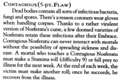 Призываю знатоков пятерочки, есть вопрос. Я тут, значит, смотрю в проклятие носферату - оно говорит, что мерит внешности брать нельзя и гвоздями прибит недостаток repulsive который дает -2 к социальным чекам. А еще там сказано, что если эту внешность скрывать, то тогда пенальти к чекам равно уровню бана. Я првильно понимаю, что для носфера с блад потенси 3 и выше штраф к социалке, когда он скрывает свою внешность, будет больше, чем когда нет?