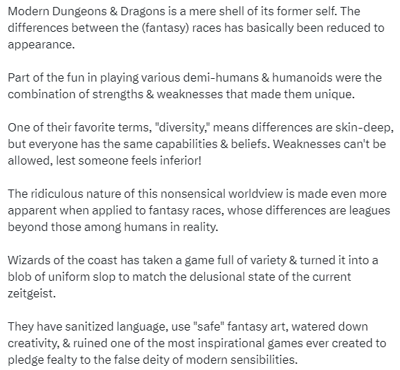 >>1636366 Будущее днд описано и оно довольно печально Кроуфорд уже признавался в интервью что они поменяли produce flame чтобы было удобнее использовать в БГ3 (комп. игре). Нанятый директор (или это был прошлый?) был спецом по микротранзакциям. Есть слухи что вся история с огл была для давления на дндбейанд чтобы его выкупить Вакансия директора по ИИ, чтобы разрабатывать нейросетевого ДМа.