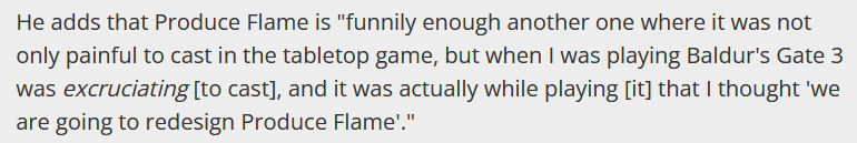 >>1636392 В 5-ке, ты мог метнуть огонь в момент каста, а мог оставить светиться в руке, и мог выключить его дисмиссом. В 2024, ты можешь только скастовать свет, а в следующие раунды метнуть, и дисмисса нет. Для настолки это нерф, поскольку ты не можешь кинуть в момент каста, а также не можешь добровольно его погасить не метнув, что чревато поджогом. Это сделано сугубо для удобства компьютерных игр, потому что так вместо двух кнопок (скастовать для света и скастовать для метания) будет одна (скастовать для света), а потом вместо двух кнопок (метнуть или погасить) тоже будет одна (метнуть).