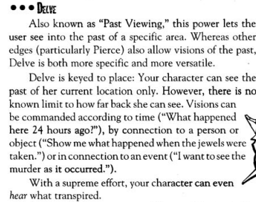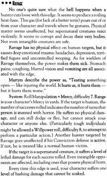 Кроме того дохуя spc сил для элдеров, celerity элдер сила, которая позволяет атаковать элдеру несколько целей, зависит от их blood potency -5, у мафусаилов celerity позволяет им доджить любую индивидуальную атаку, нужно 100 м радиус вокруг них ебнуть, чтобы им чёт было. Auspex сила у мафусаилов позволяет им сделать так, что если ты откроешь глаза, то ты видишь солнце и получаешь демедж как если бы ты видел солнце. Protean сила позволяет мафусаилу при смерти регенировать из животных в километре вокруг него. Protean для элдеров позволяет им игнорировать материал, который их атакует после того, как они получили им урон, так что им может быть похуй на свинец или дерево или сталь. Fortitude сила мафусаилов позволяет им перенаправить урон в их потомков. Oblivion сила позволяет им открыть черную дыру, которая жрет все вокруг в 30 метрах. И дохуя других сил.
