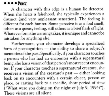 >>1634737 >Только на 6+ С первой точки. В пятерке с 3й. Правда именно с первой он получит инсайт не из воздуха, а если хоть иногда куда-то ходит и имеет шанс пересечься с кем-то из охотников в рамках одной локации. Что несложно, ведь охотникам придется самим подбираться поближе во время разведки. >The Storyteller may also use this power to see if the character perceives a threat и там дальше примеры. >Удачи с хантер-нет Вампирские охотники это, как правило, их личная подлинейка, а не Наделенные и уж точно не маги. И, кстати, хантер-нет дважды ломали. И если смотреть с точки зрения реализма, возможно взломов было куда больше, просто их не палили. Ну и вроде охотнику ничего не мешает туда зайти, если, скажем, он будет загулен или под доминированием. >И она тоже занимается Погромом, если чо При наличии на поле Технократии или других магов, охотников можно просто не брать в расчет. >информация сливается тем же темпларам Хористов Это откуда такая инфа? >базовые знания по вампирам города Ну, если вампиры города пиздят о своих делах, слугах и убежищах каждому встречному неонату, то да, это сработает.