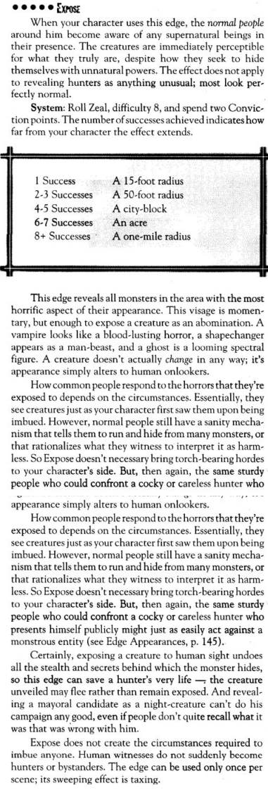 >>1634734 > кто-то с ауспексом Только на 6+ (и то на 6 нужно конкретная цель), контрится линейщиной, контрится магами, контрится хантерами, контрится истинной верой, контрится банальным дудосом (вместо отдельного действия по захвату одного неоната в одном городе идёт повсеместная охота. Привет Погрому, который как раз про это) >Auspex 6: Horoscopic Forecast: Gain a glimpse of the target's future >Auspex 9: Sight of the Oracle: Always know what is happening around you, gain visions of past and future events, and increase other supernatural senses >Ну или постоянно роющие что-то носферату что-то узнают Удачи с хантер-нет, закрытыми физически сетями, гипертекстовым фидонетом диджитал вебом адептов виртуальности, и прочими сходками в Умбре. лол. >Так это же Технократия, а не охотники И она тоже занимается Погромом, если чо. >было строго похуй и максимально поебать. Экчуалли нет. Вампиры НЕ первостепенная цель пока держат маскарад и не выходят за рамки дозволенного, однако на них не похуй и информация сливается тем же темпларам Хористов или Фламбо герметистов или потирам эвтанатои >Зачем? Затем что есть базовые знания по вампирам города у любого местного неоната, а дальше как повезёт.