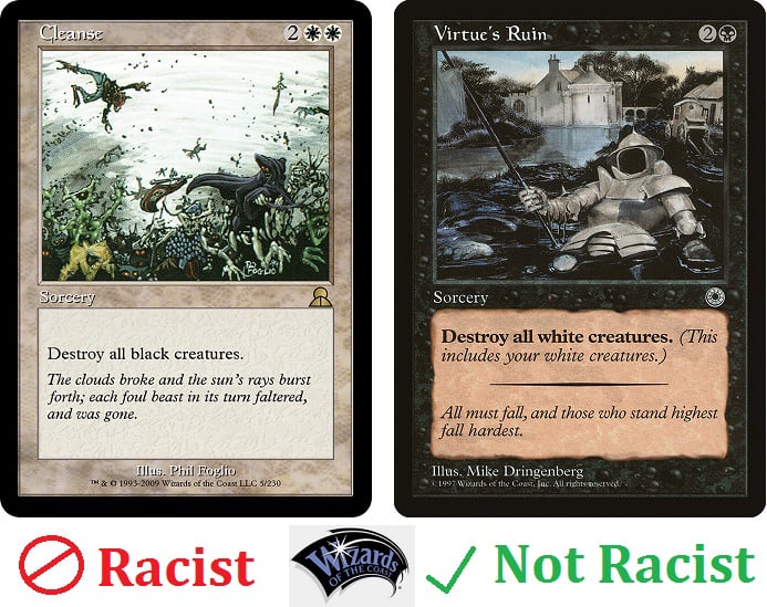 Они белые по цвету маны, а на артах нигры. У левачья так всегда: если реальность не согласуется с их манямирком, тем хуже для реальности. В реальности нигры, феминистки, ебанутые с разноцветными волосами и неопределенным гендером нихуя не занимают важных мест в обществе, ничего культурно ценного не производят. Но левачье из визардов пихают этих дегроидов на каждый арт более-менее играбельной карты.