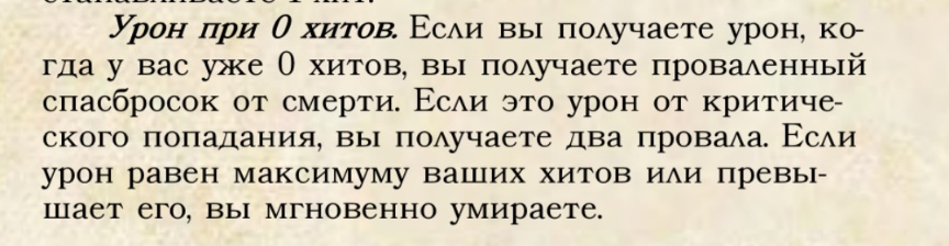 >>1641506 Хп может уходить в минус. Если у персонажа минус максимум хитов, то он умирает. Например если у персонажа 12 хитпоинтов, то он безнадежно умирает если в общей сложности нанести ему 24 урона.