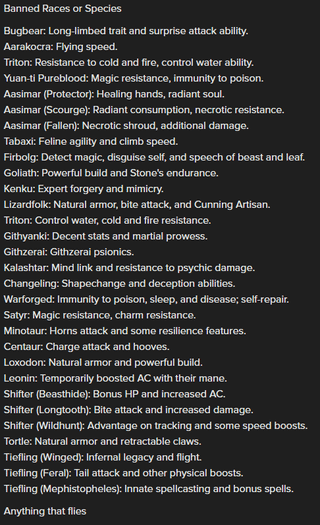 >>1644385 Какая-то шиза по большей части. Я понимаю там бан ааракокры или имбанутых архетипов из таши, но че такого в пхбшных подклассах и абсолютно безобидных рас типа лизардфолка или табакси, кроме разве что из эстетических соображений. А Wish я бы не банил, а либо сделал его одноразовым (как если бы сразу выпало меньше 33 на стограннике), либо сделал поиск этого заклинания целым квестом.