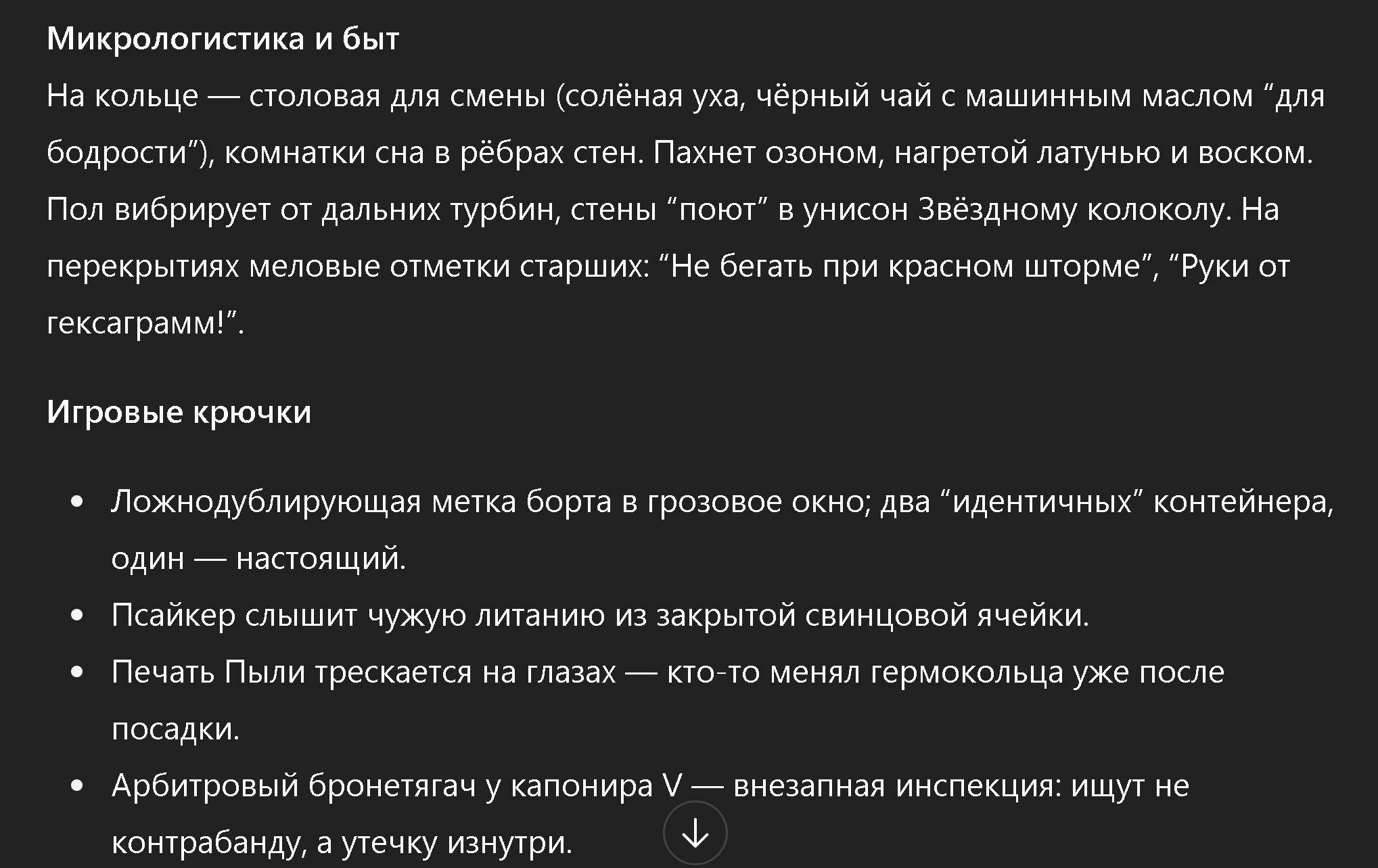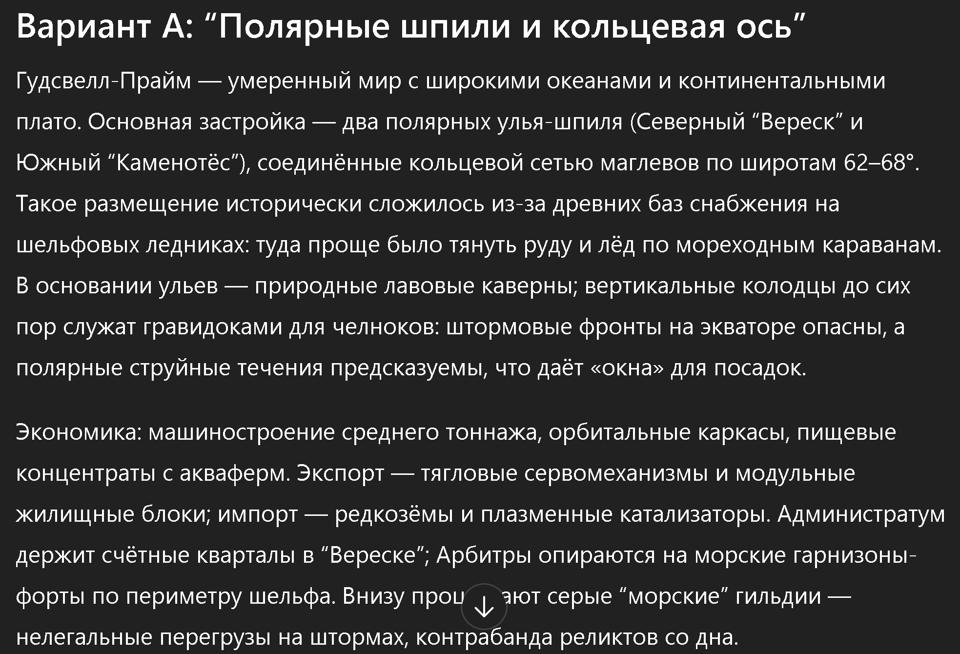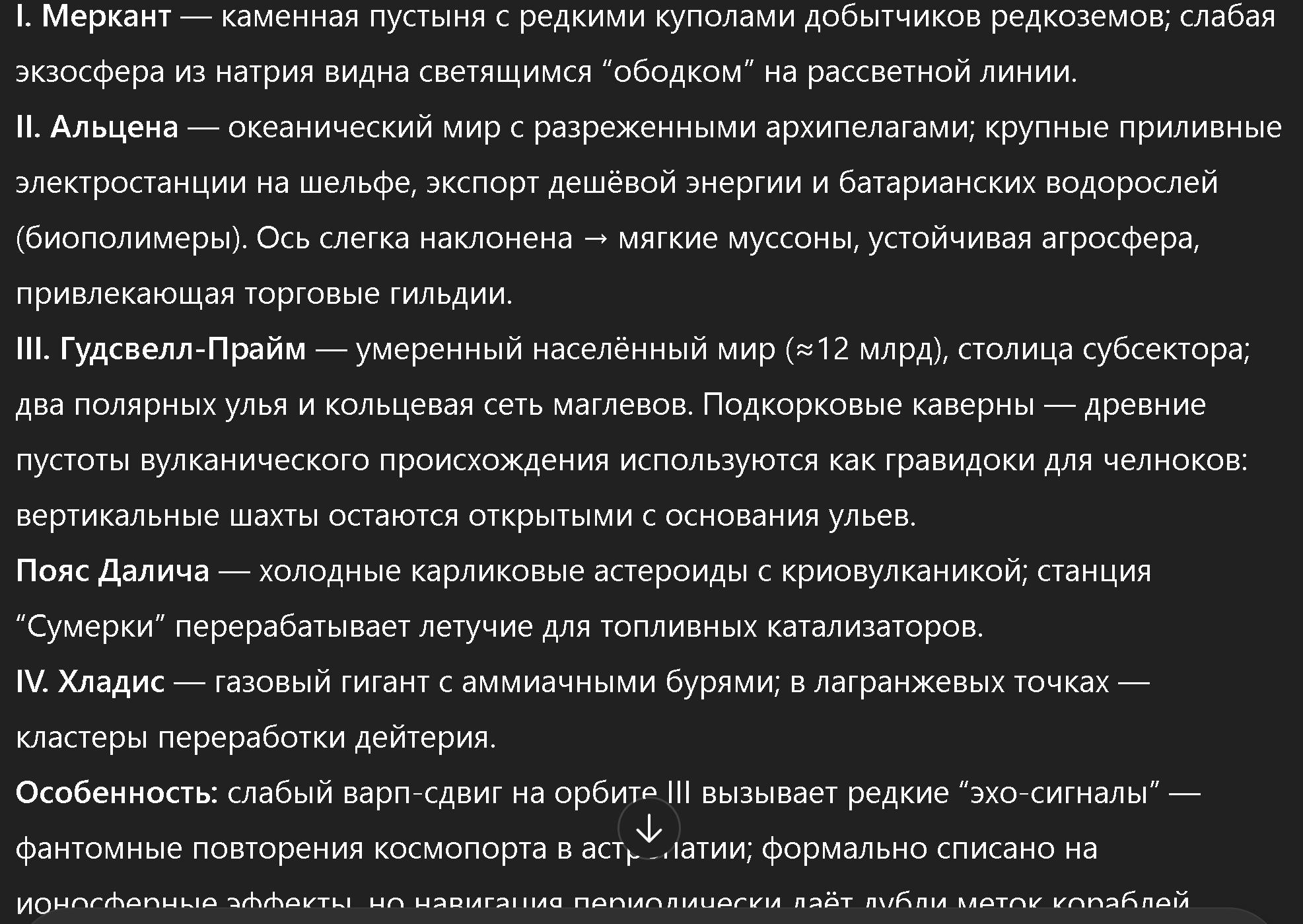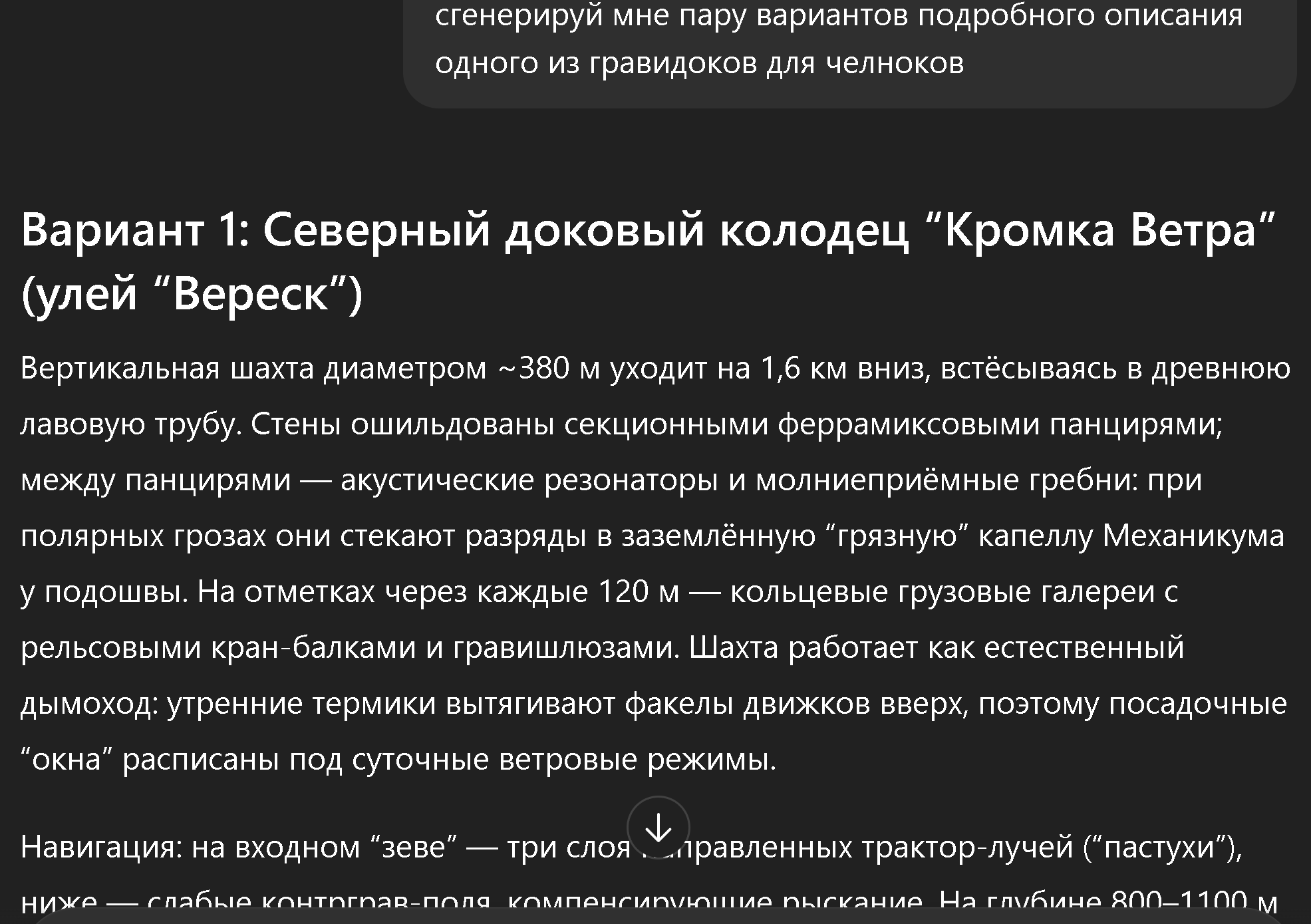 Нахерачил промпт чатугпт на 47кб. После которого он по требованиям вида "СГЕНЕРИРУЙ МНЕ ТРИ ВАРИАНТА NNNN" выдает что-то такое. Пытаюсь с помощью этого задумать сюжет для серии игр поинтереснее. Нихуя не получается - он генерит интересно, но у меня нет фантазии, а я хз что с этим делать.