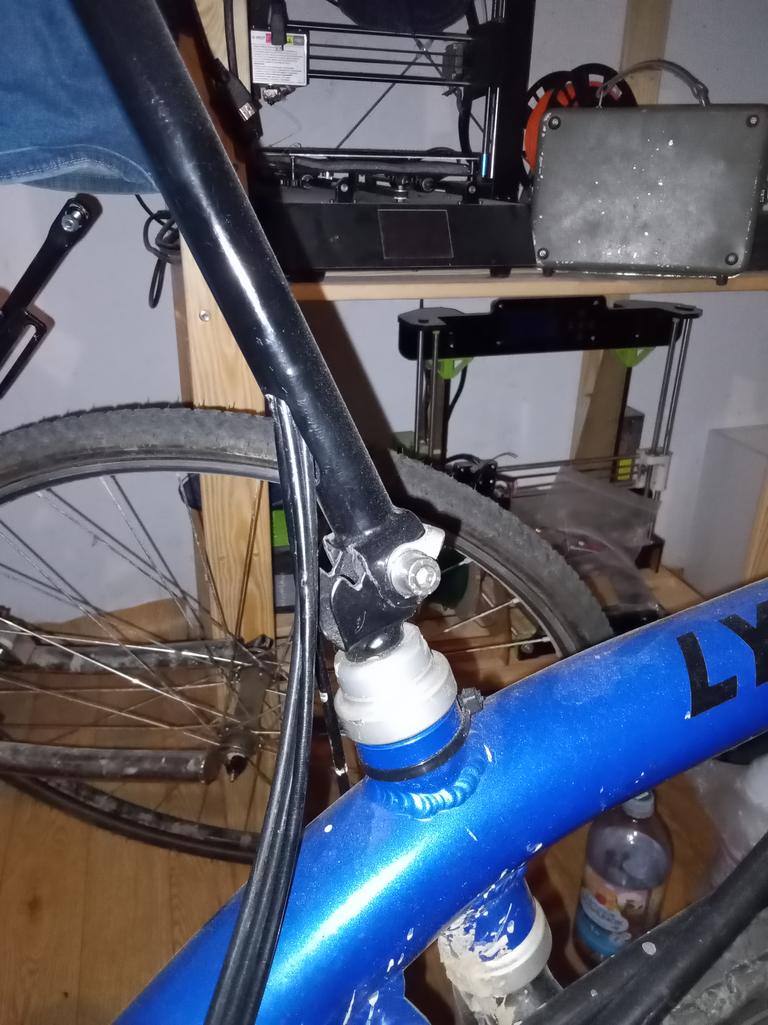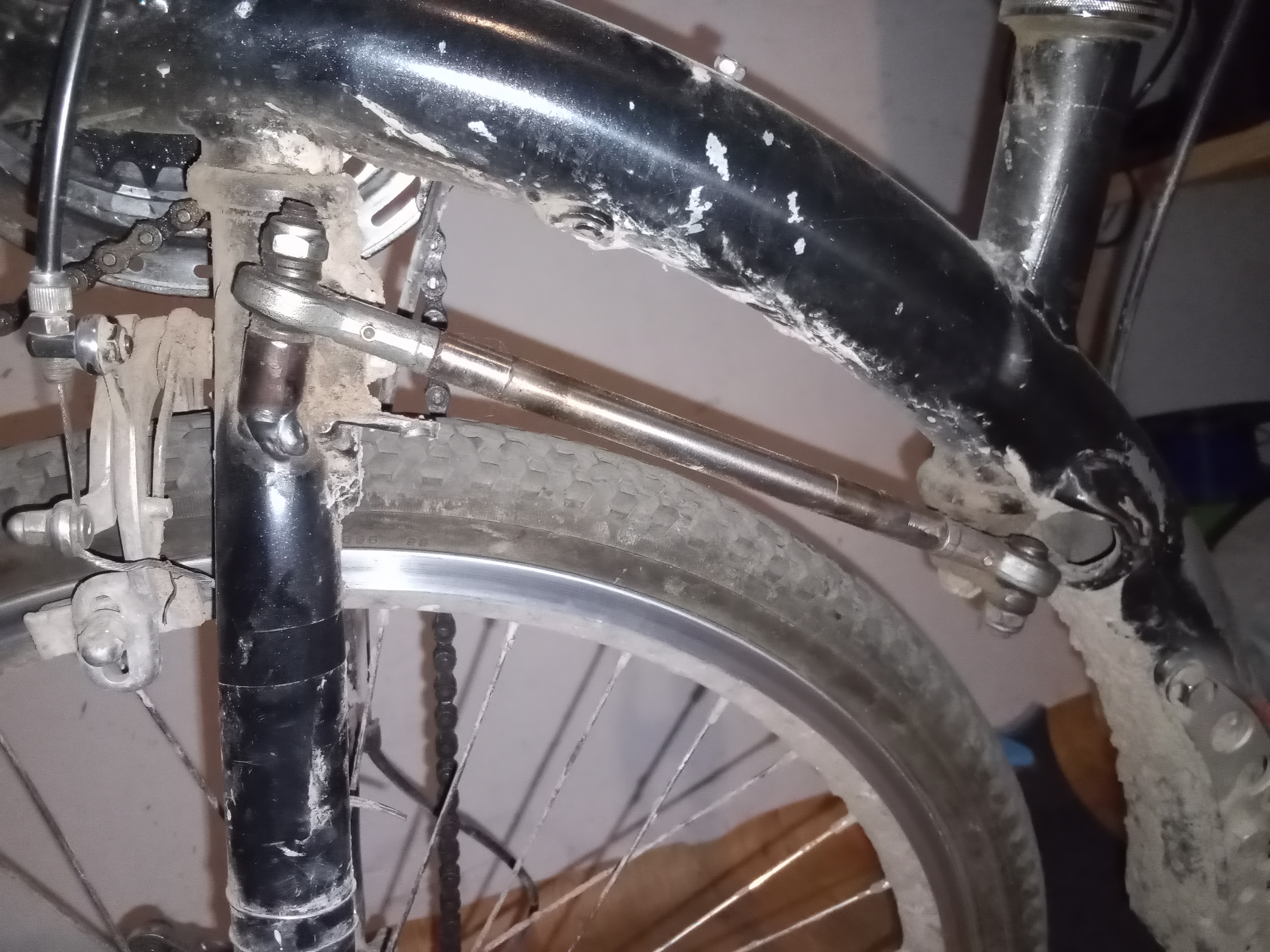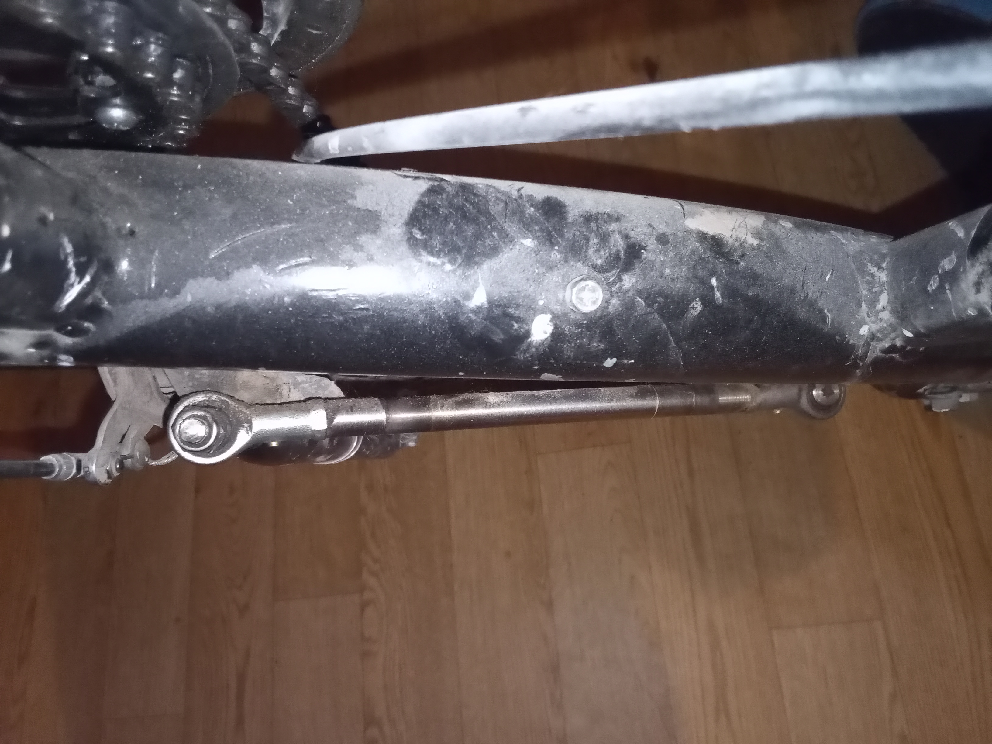 Наиболее всратые узлы наркосипеда, особо радует вырез в раме под шарнир тяги. Я бы просто изготовил два кастомных выноса, что дало бы возможность использовать стандартные вилки. Также шарниры на разных расстояниях от осей, что даёт некоторыйээое уменьшение угла поворота колеса.