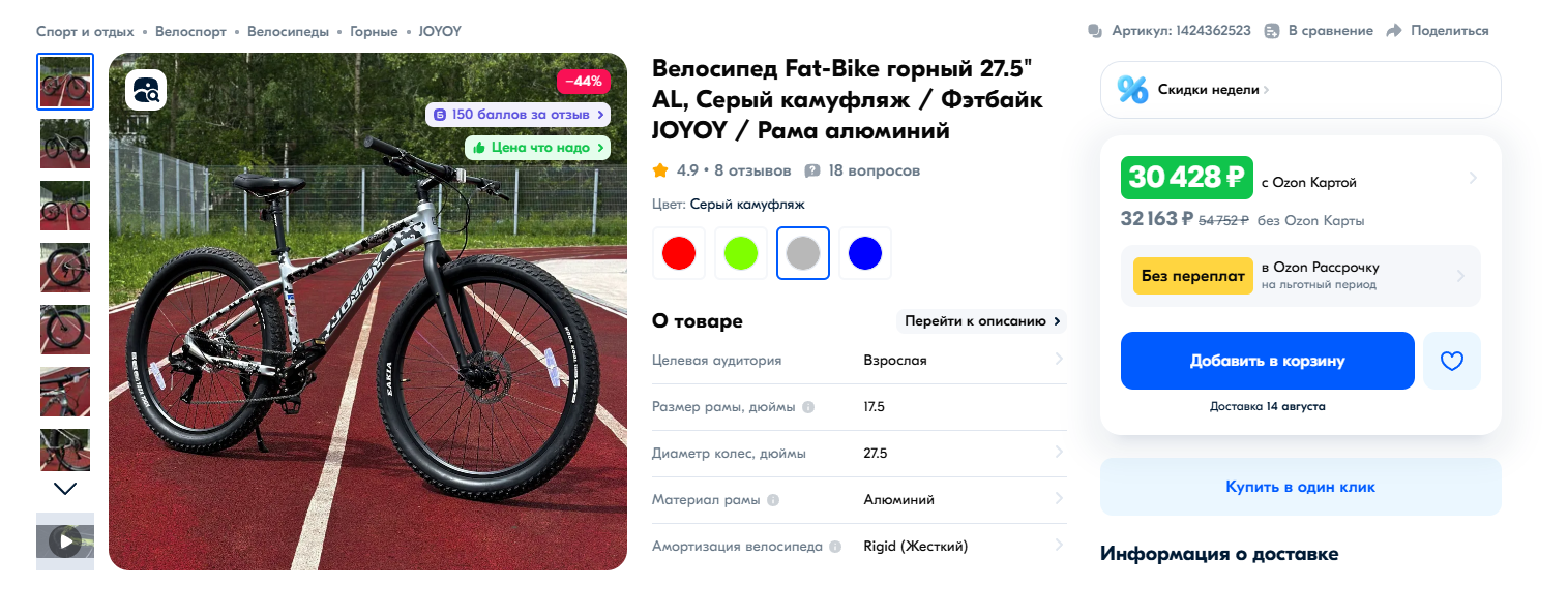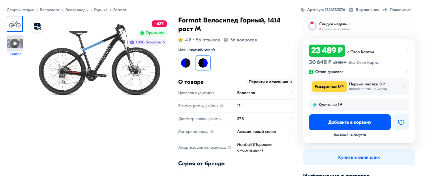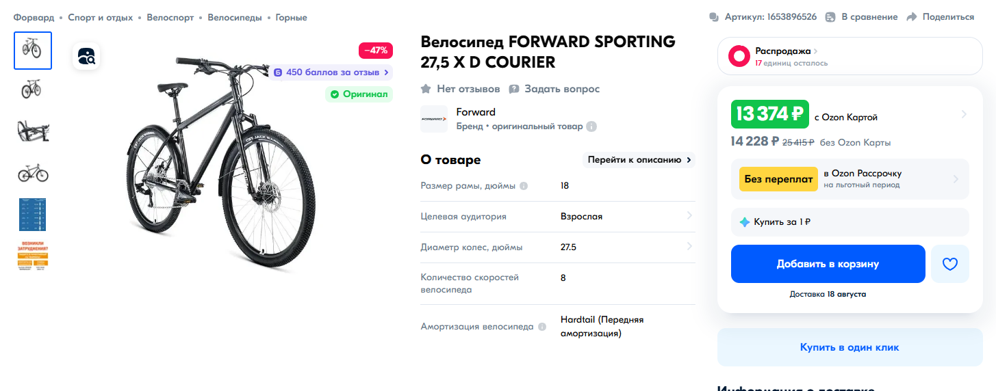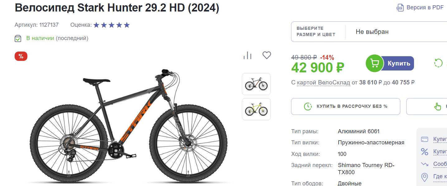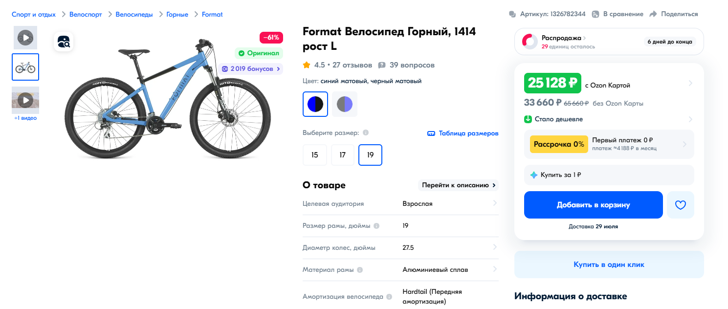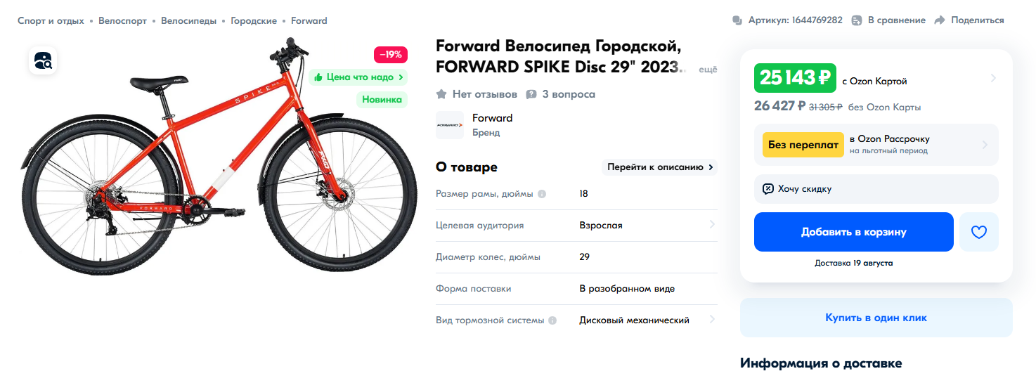https://ozon.ru/t/YolK0AM Неплохой вариант для тех кто ищет себе бюджетный велосипед кассета, дисковые механические тормоза, каретка на промах, втулки на насыпных подшипниках, вилка ригидная 18 рама на рост до 180 см. Всяко лучше чем то, что предлагает Desport (бывший Декатлон) и другие за эту цену. У меня цена 12905 по озон карте стоит московская обл.