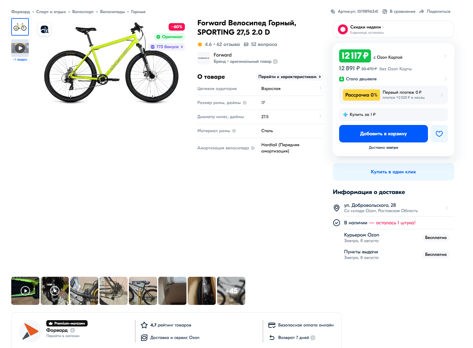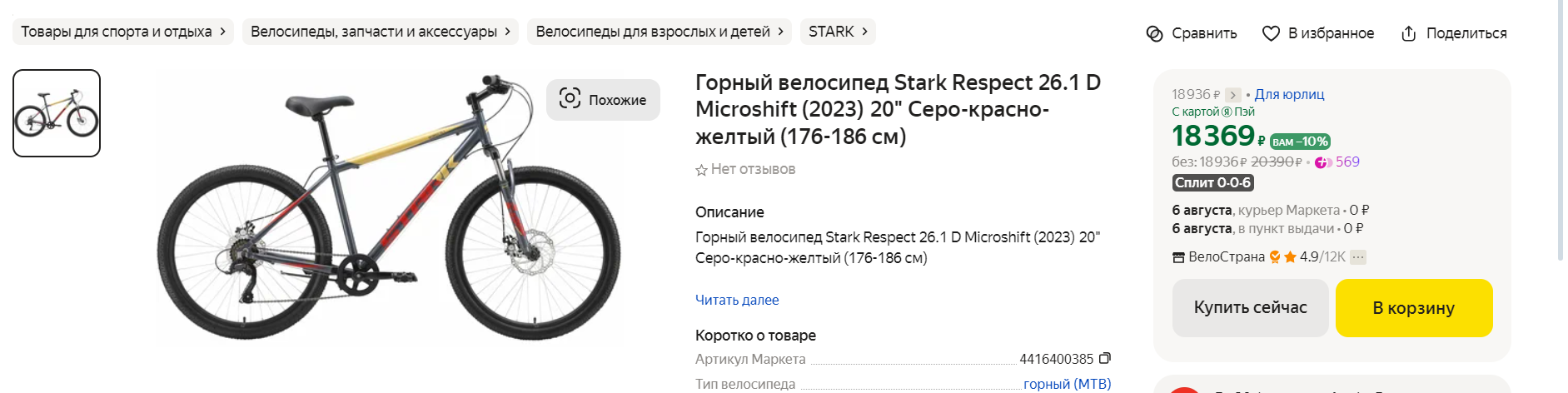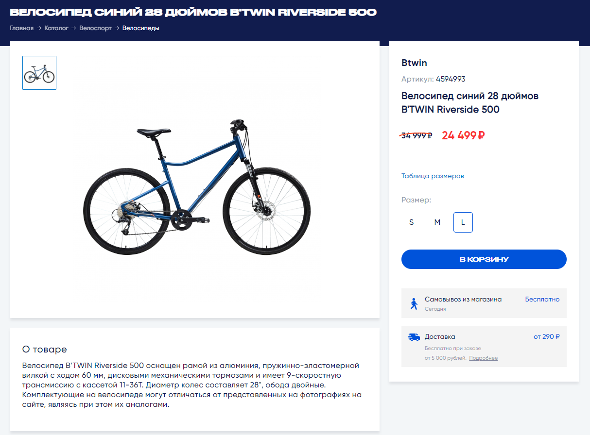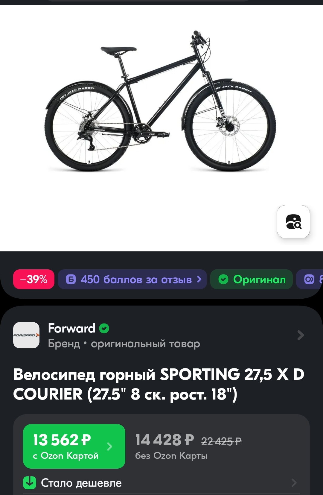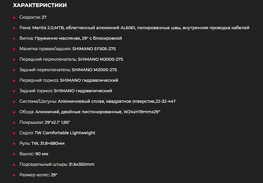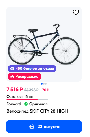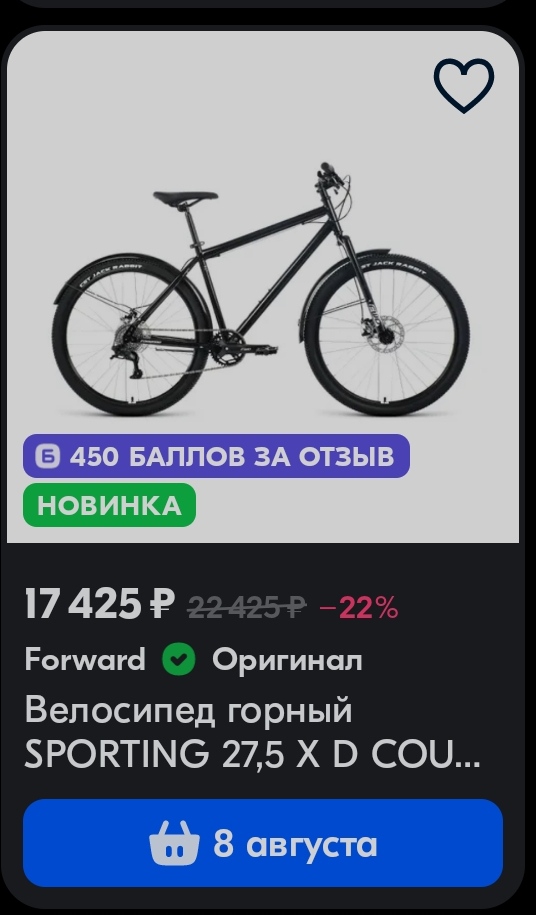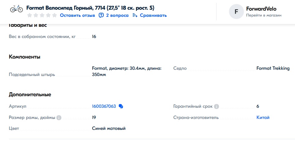 https://ozon.ru/t/YolK0AM Неплохой вариант для тех кто ищет себе бюджетный велосипед кассета, дисковые механические тормоза, каретка на промах, втулки на насыпных подшипниках, вилка ригидная 18 рама на рост до 180 см. Всяко лучше чем то, что предлагает Desport (бывший Декатлон) и другие за эту цену. У меня цена 12905 по озон карте стоит московская обл.