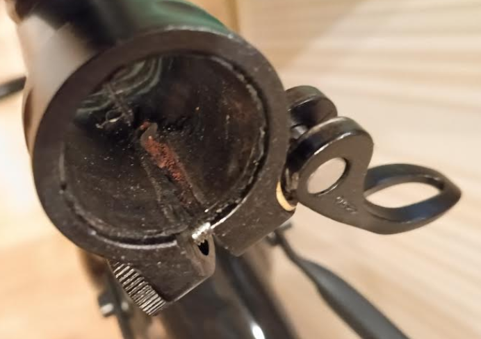 Памагите с седлом и эксцентриком. Он должен полностью закрываться? И еще у меня посыпалась не понятное место у седла. Из-за чего это? Вот на 3 фото он полностью не закрывается и не понятно как держит....