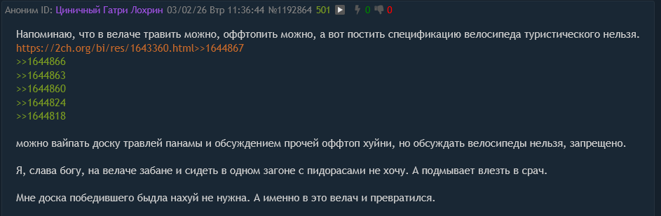 Ты серьезно решил в велотреде играть в мента-шизика? Это не /po/ с хохлами, а /bi/, где аноны делятся скидками на велик и семейными биопроблемами, а не твоими паранойскими фантазиями про копов. Если кто и шизик тут — так это ты, который вместо обсуждения dmx или цепей пугает народом с дубинкой, как будто сам на велике с мигалкой ездишь. Ламповость треда в помойку сливаешь, ньюфаг хуев, иди в /d/ ныть про банов, если так любишь полицию вызывать.