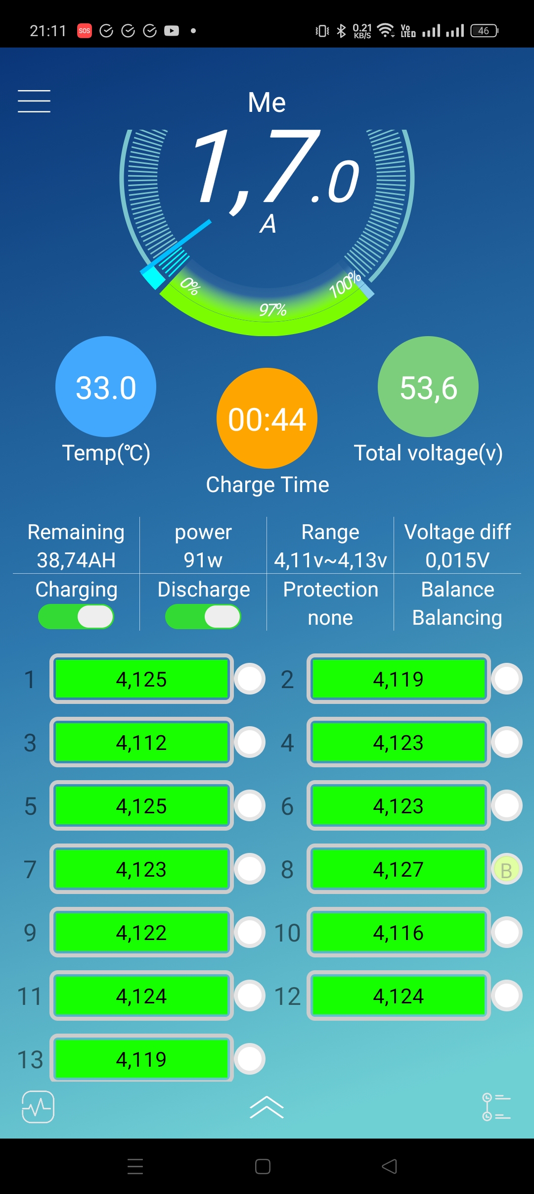 Ну и советую на БМС не экономить. Она не расходный материал в отличии от ячеек. Советую такую https://aliexpress.ru/item/33000762621.html или похожую. У неё есть блютуз и можно в любой момент посмотреть что с батареей происходит с помощью телефона.
