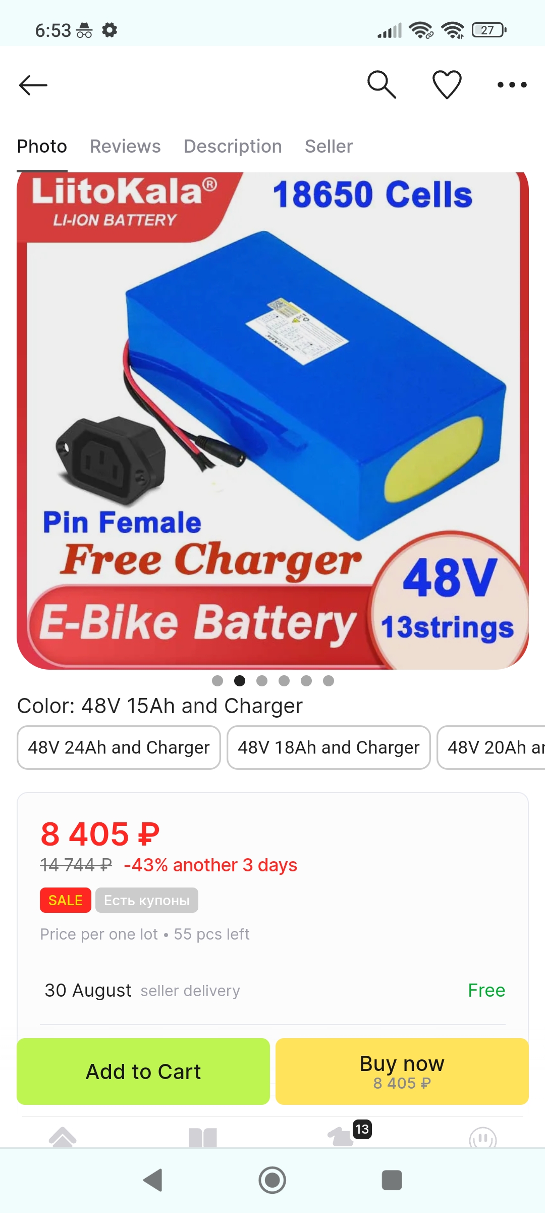>>1513411 Минимальную скорей всего на зимней распродаже поймать можно разве что. Что не скоро. Рынок на предмет хороших предложений советую высматривать самостоятельно. Советую высматривать на озоне, например https://www.ozon.ru/product/akkumulyator-21700-vysokotokovyy-inr21700-48t-4800-mach-12-16-mom-li-ion-3-7-v-10-sht-1265752512 неплохой вариант. На озоне сейчас дешевле чем на алиэкспрессе. Советую взять лишних 4-6 ячеек, просто чтобы были запасные, плюс в них отсеяться худшие по ёмкости. Форм-фактор 21700 чуть лучше в соотношении цена/ёмкость, но 18650 тоже сойдёт.