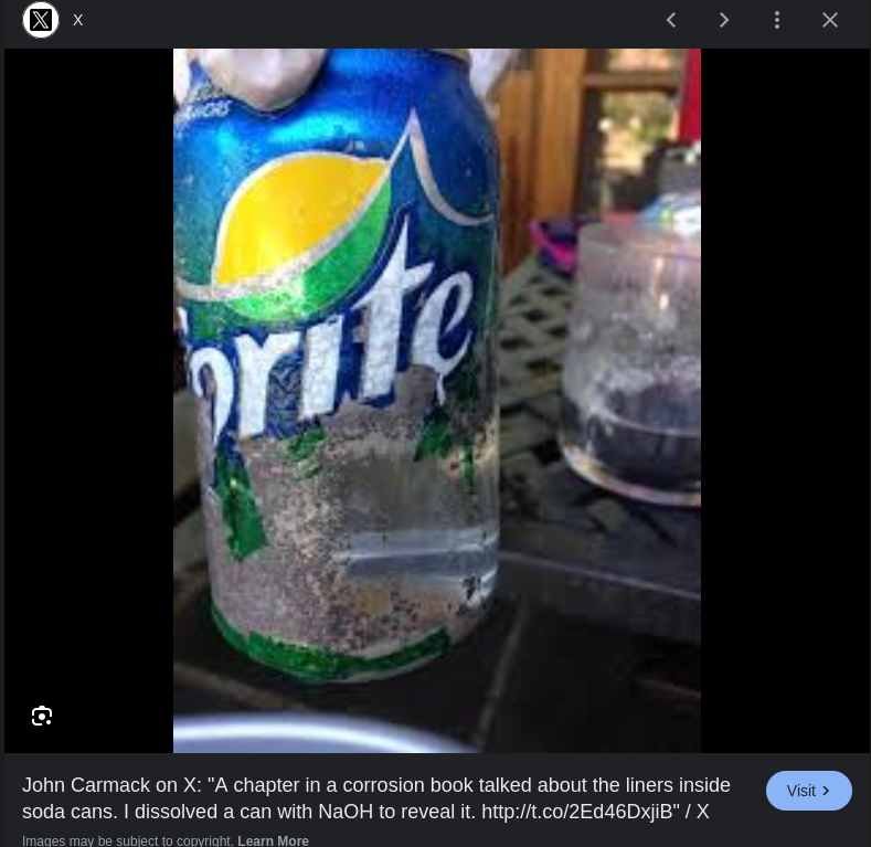>>1515714 >Внутри они покрыты пластиком, который защищает напиток от алюминия Как и алюминий от напитка. >а снаружи там какого-то сорта краска Лак. А поверх него краска. >И алюминий особо не кородирует сам по себе Ололо долбоёб. >банки вообще закрыты защитным слоем защищающим от корозии Ты его успешно счистил, когда вкручивал в этот защитный слой каретку. Не говоря уже о том, что ты счистил его с краёв, когда резал банку - этого достаточно для полного пиздеца (водопроводчики не дадут соврать) >Езжу с банкой в каретке уже полтора года С банкой в дупле ты ездишь, кузьмич.