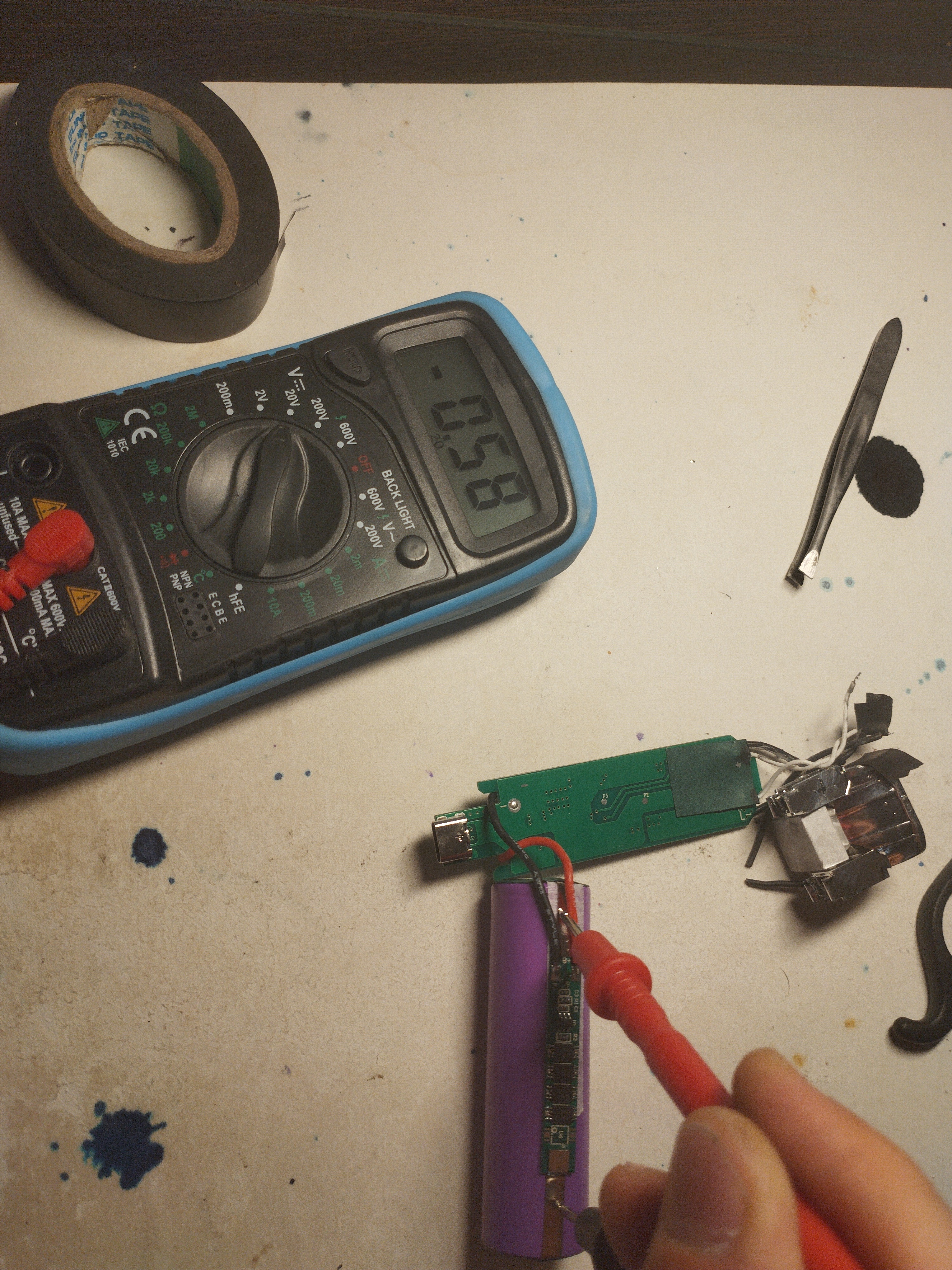 >>1539746 >На припой ставлю щупы - 0V. Вангую, что проводок оторвался от аккума. Или сам аккум с защитой и она сработала. Расковыривай эту синюю термоусадку.