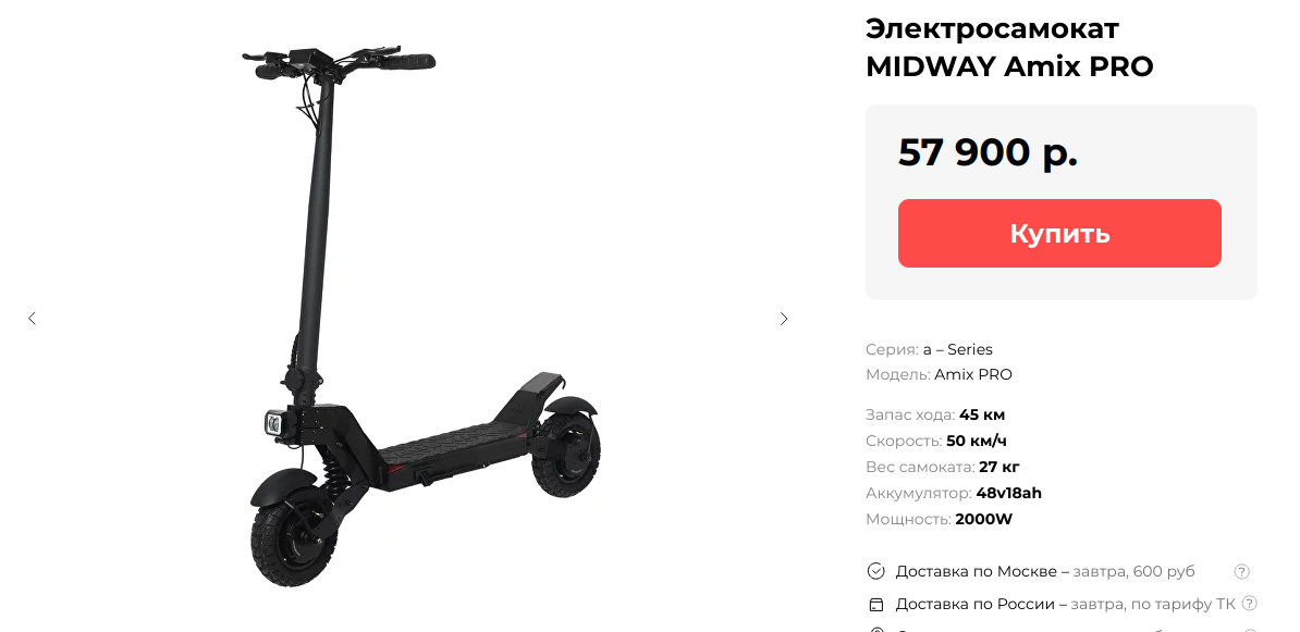 Купил себе и жене по midway i-one pro. Женщина маленькая худенькая, ей самокат в самый раз. Я же боров 195см/100кг, мне оказалось слегка маловато, батарея высаживается почти в два раза быстрее, чем у жены. Да и когда один куда-то еду, хотелось бы побыстрее, скорость до паспортных 30км/ч разгоняет с большим трудом. И я не говорю о том, что нужно перед каждым выездом подтягивать болты рулевой.