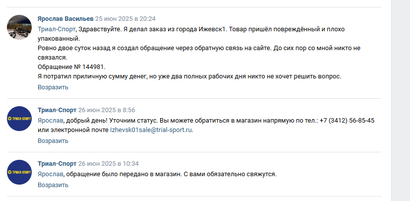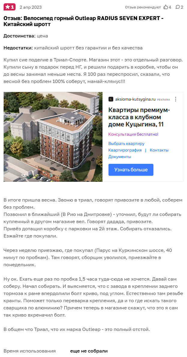 Лол. То ли дело триал: вел продали с каким-то китайским хуйпойми колесом, оригинальное спиздили, на жалобу через сайт ответили посылом нахуй, в вк тоже послали нахуй. Охуительный сервис. Давай, хуярь по методичке, пиздони что надо было самому проверить или ещё что там.