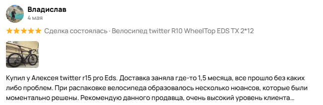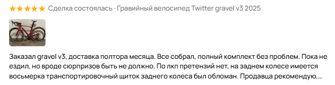 Colnago G3X (Велоспорт) - велосипед был собран в зал с установкой всего. Наклейки помяты, подседел расцарапан в хлам, проебаны все документы и вообще все, что шло с ним в комплекте. Потенциально поребаны доп. кольца штока вилки. Упакован без снятия цепи, зато с снятием заднего колеса, цепь побила перо/переключатель. С зала не настроены тормоза и проч., хотя гидролинии протащили. Моменты затяжек и проч даже не смотрел, вернул нахуй.