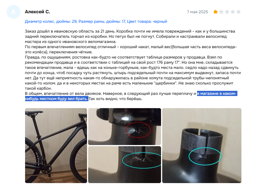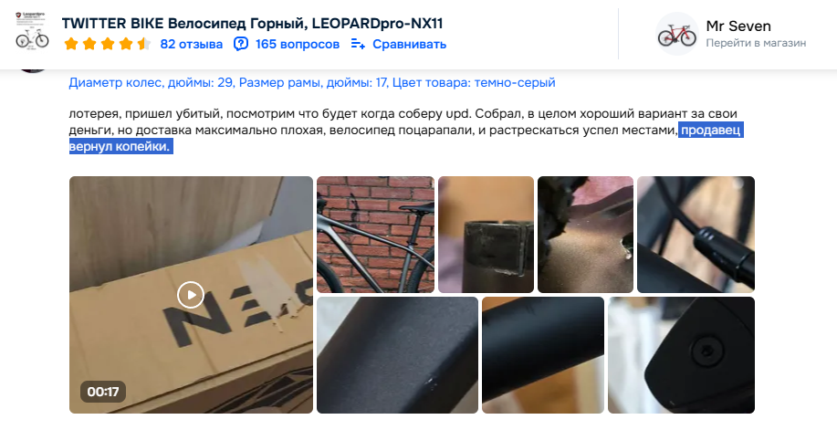 У меня ни разу не было косяков с покупками в магазинах. А покупал я, нарочно посчитал, не менее восьми велосипедов. Один раз была царапина на раме, об этом мне сказали сразу, и скидку сделали (копеечную, но всё же). В коробках покупал три велика. С одним всё было ок, с другим тоже, но ТК расхуярила всю коробку, даже странно, как лясик доехал. На третьем были люто перетянуты втулки и не закреплен трос на заднем переключателе (это был мтб на 24 колёсах для пиздюка).