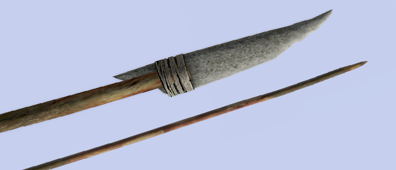 Не нож примотанный к палке, а резец/наконечник примотанный к палке, то есть ретушированный скол кремня, обсидиана или ещё чего. Это не было основным средством охоты. Это просто острый предмет. Примотать к палке нож таким образом, как у тебя нарисовано, не выйдет. Он отвалится. Отщеп вставляли в расщеплённую деревенную основу и фиксировали клеем, например древесной смолой.