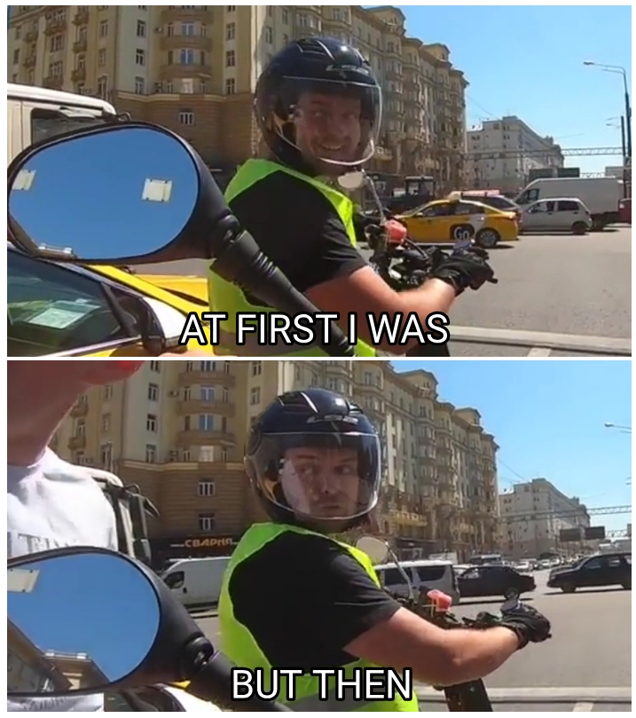 Я вчера чуть дэпоса не сбил, двигаясь по правому краю проезжей, лол. Он тормознул фуру на другой стороне дороги и не глядя по сторонам пошёл к ней. Ну а я посмотрел назад, убедился в безопасности, махнул левой рукой и объехал этого разъебая прямо перед его носом.