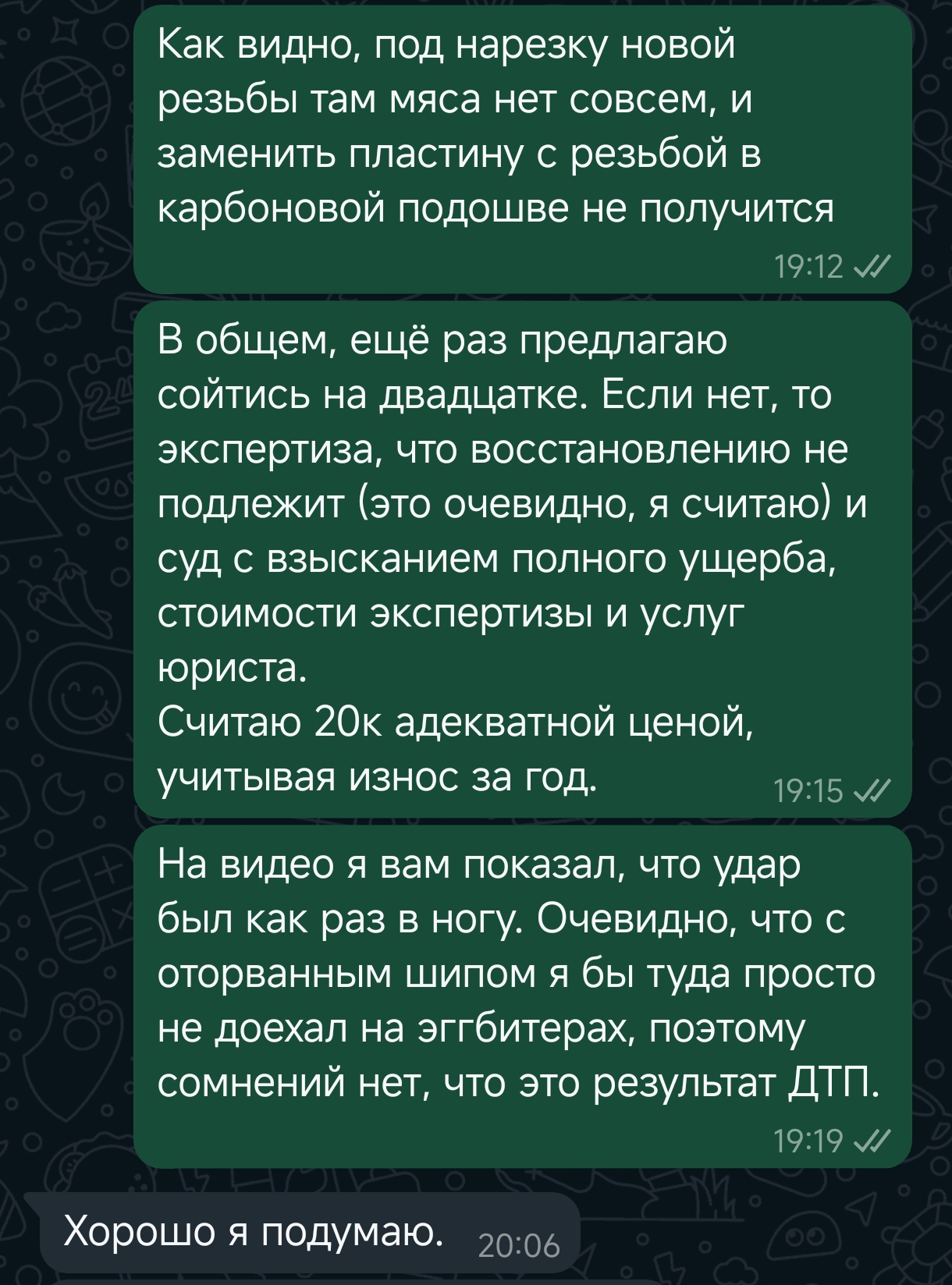 >>1546519 У нее муж, вроде, адекватным оказался. Пока она визжала "а трусы ты там не повредил от страха", он попросил ее заткнуться, посмотрел чек о покупке туфлей, чек из такси (тариф минивэн с велосипедом) видео, где я показываю повреждения на ее корыте и на моем ботинке (ботинок задела колесом, так что и на покрышке, и на ботинке остались четкие характерные следы). Я предложил ему выплатить 20к в виду того, что ботинки уже не новые, и предупредил, что в случае отказа пойду в суд, где буду взыскивать полную стоимость + все издержки. Он попросил прислать фото/видео вырванного шипа, чтобы он убедился, что повреждения действительно необратимы, что я вчера вечером и сделал. Его ответ на пикче, теперь жду.