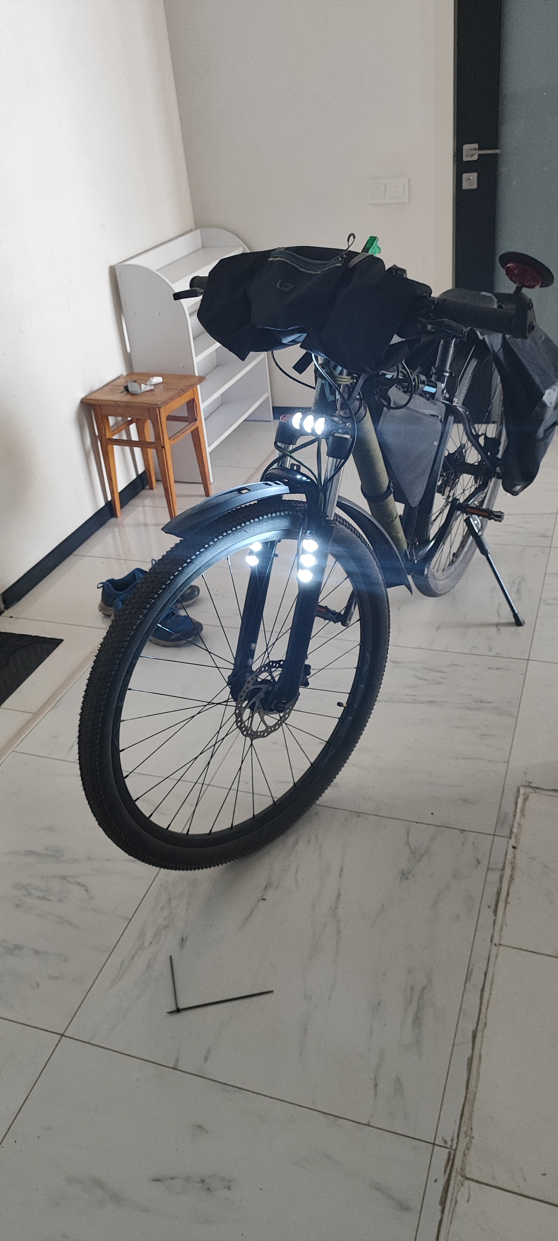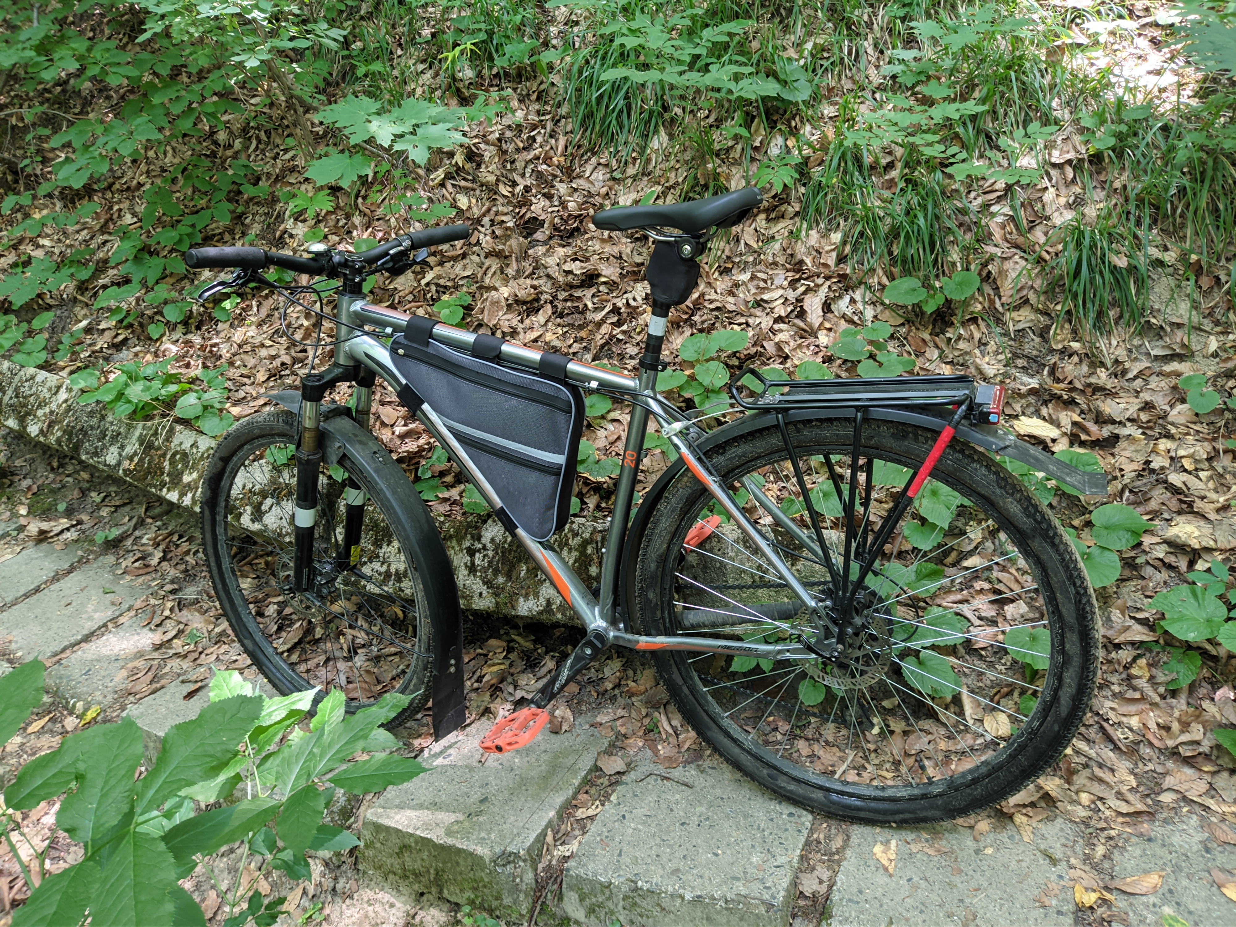 Вот такого собрал, через месяц перекину все на раму dartmoor primal v2. Но если бы здесь была ось, оставил бы, больно хорошая и удобная рама. Ну и потихоньку обзавожусь навеской различной) Вилка жирная, потому что я жирный) надеюсь, что велосипед поможет с похудением)