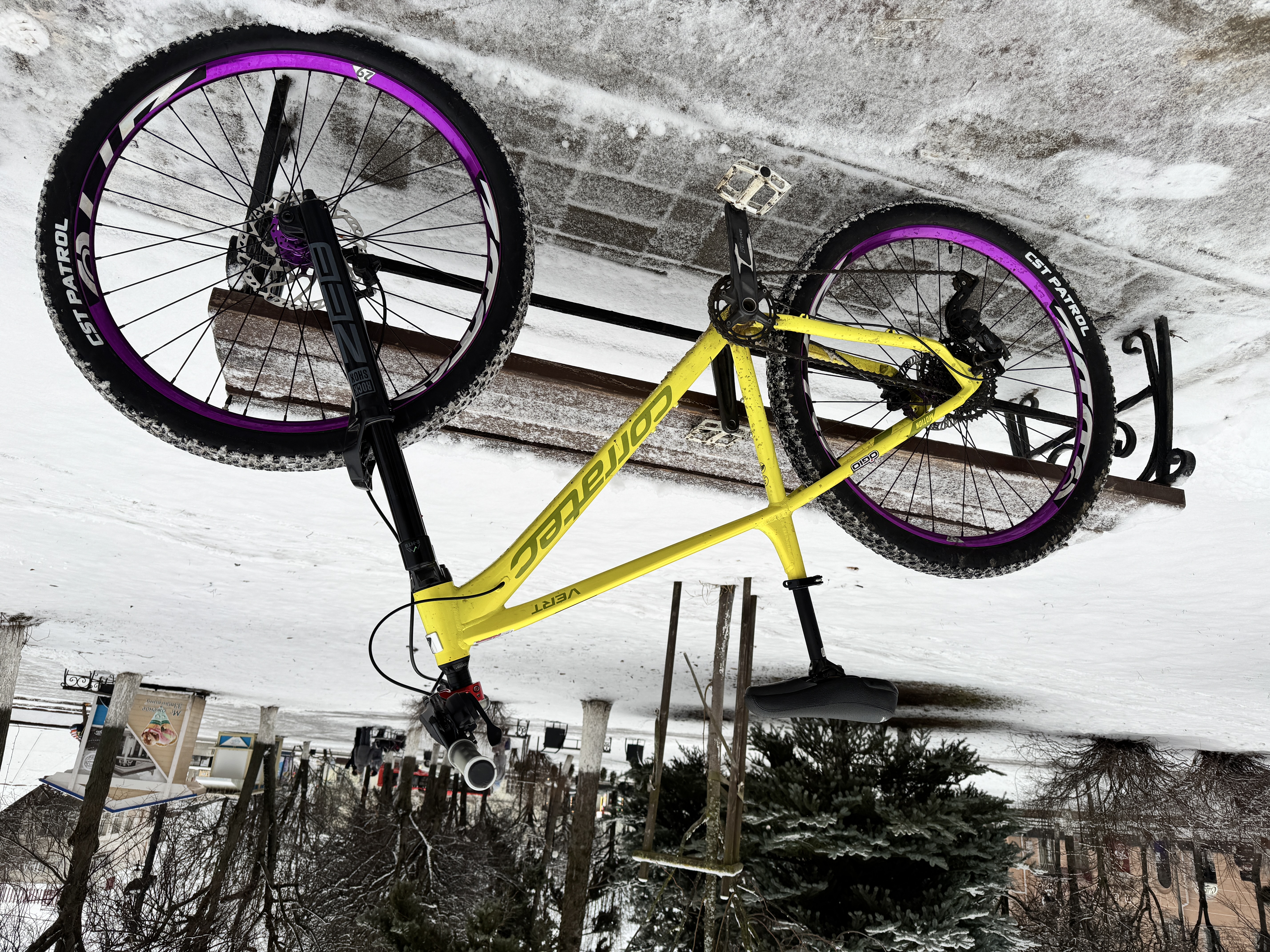 Giant revolt 2, в целом сток, кроме обмотки руля. Приятный для вкрута по асфальту и всяким парково - дачным грунтовым делам, после подвеса амортизация как у куска забора, но я уже привык, нет потери инерции, кайф. Донастроил наконец Сору - ахуенно щёлкает, на 105 менять не хочу, разве что тормоза не гидравлика - не хватает их бывает, но я у мамы быстрый, нахуя мне тормоза.