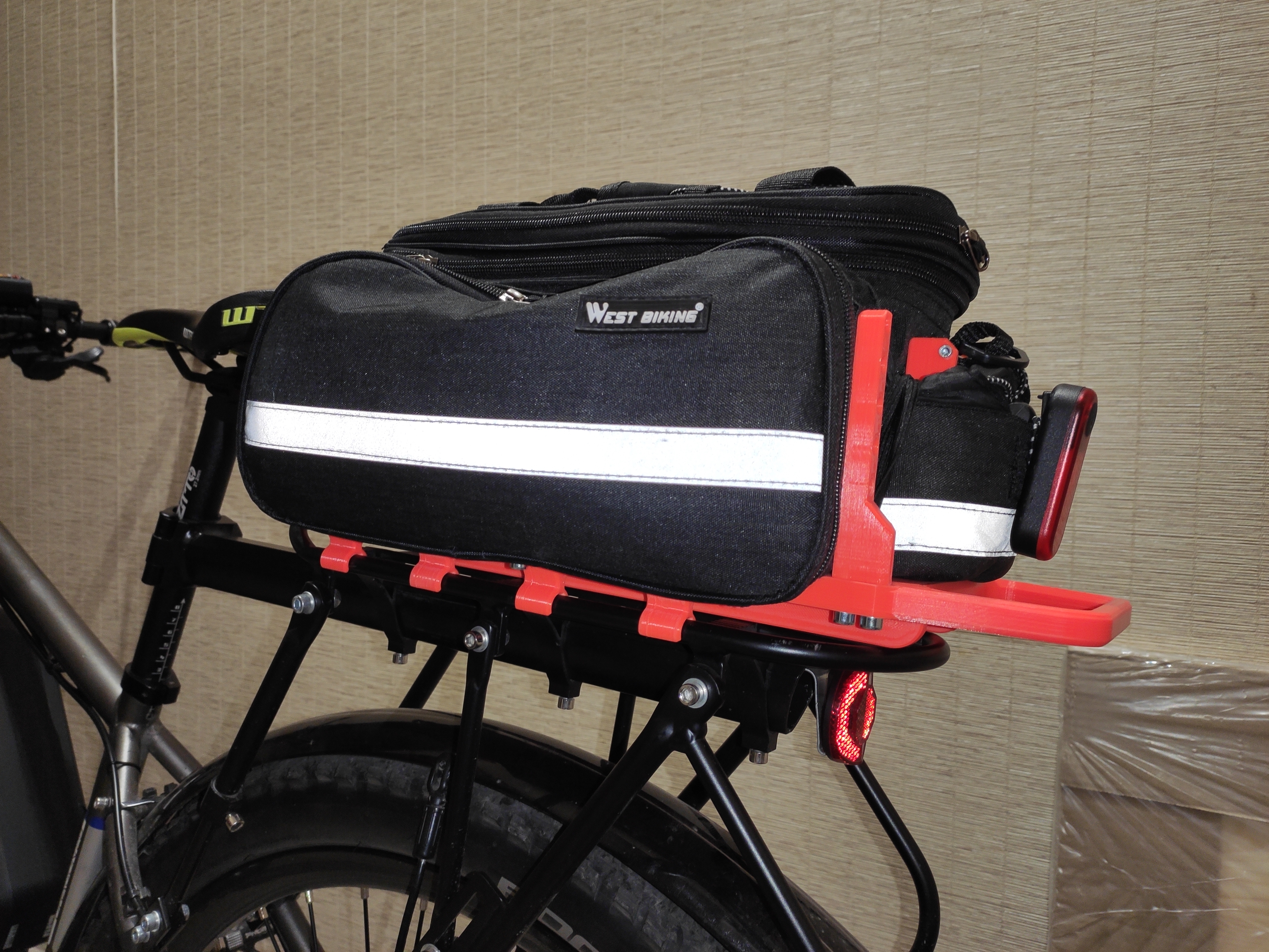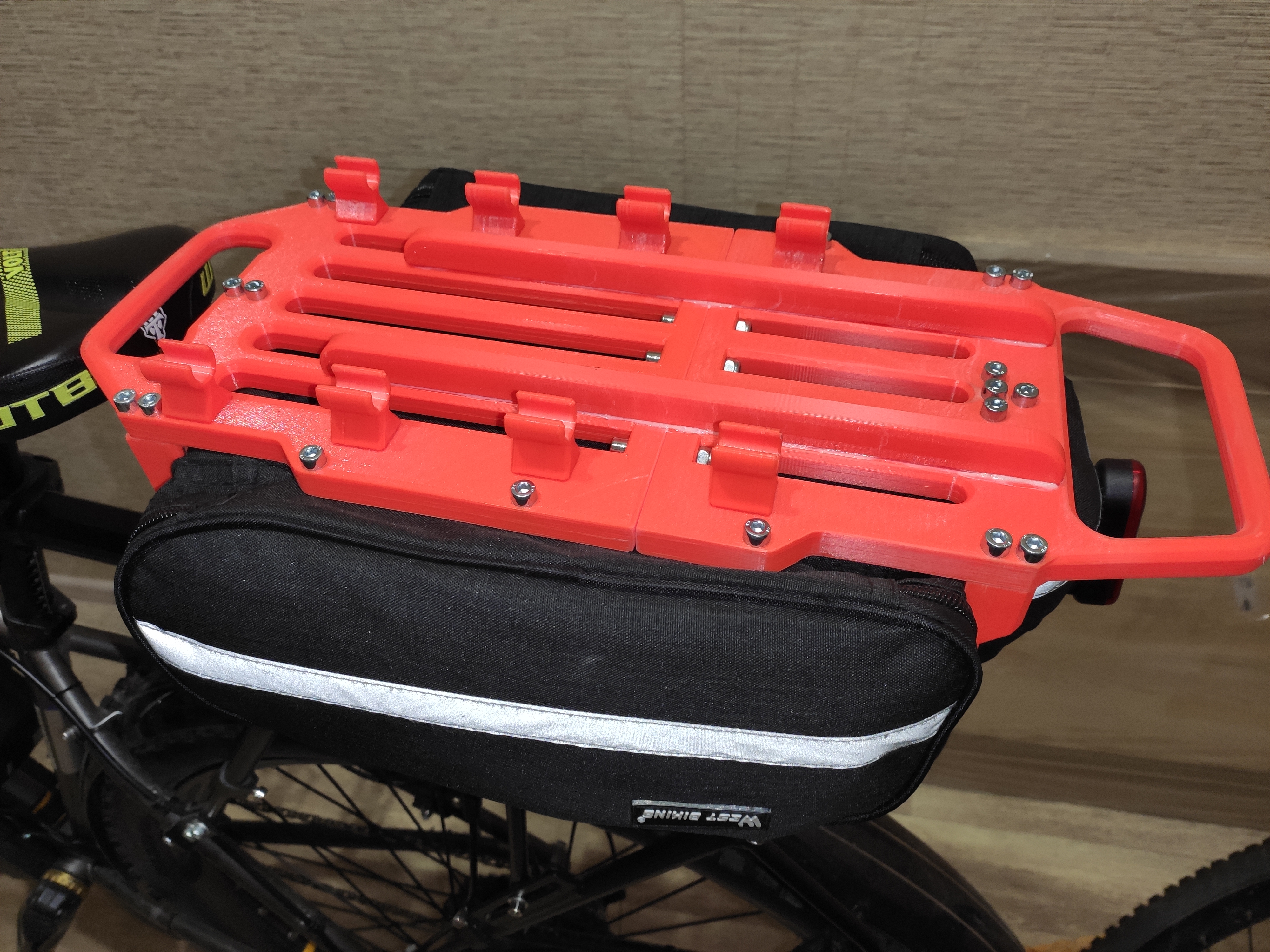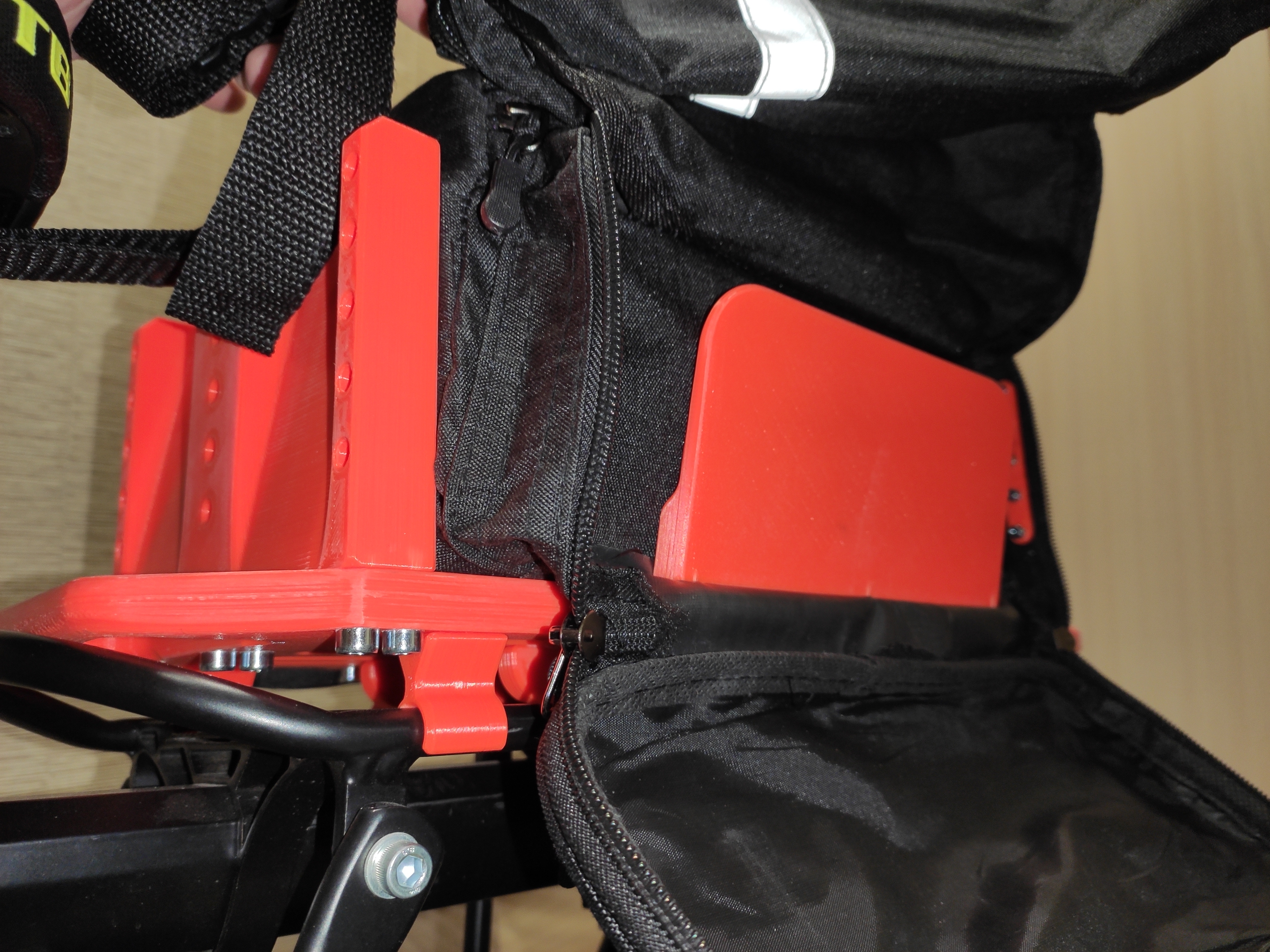 Наебался с сумкой, которая вместе с багажником была. Стропы и липучки пришиты крайне хуёво, всего за две недели одна из нижних липучек оторвалась с мясом, остальные тоже на честном слове держались. Психанул, спроектировал скелет для этой ебучей сумки и напечатал. Скелет с быстросъёмным основанием, просто встёгивается и выстёгивается из багажника а для страховки сумка фастексом цепляется к седлу :). Держится крепко, за заднюю ручку можно поднять велосипед. Но, если дёрнуть резко, то выстёгивается скелет. По бокам (внутри, пик 4) есть поперечные стабилизаторы, чтобы ебала внутри сумки не перевешивала на одну сторону. Все соединения винтовые, всё (кроме основания) разбирается, при желании любую из деталей можно дополнить по функционалу и перепечатать.