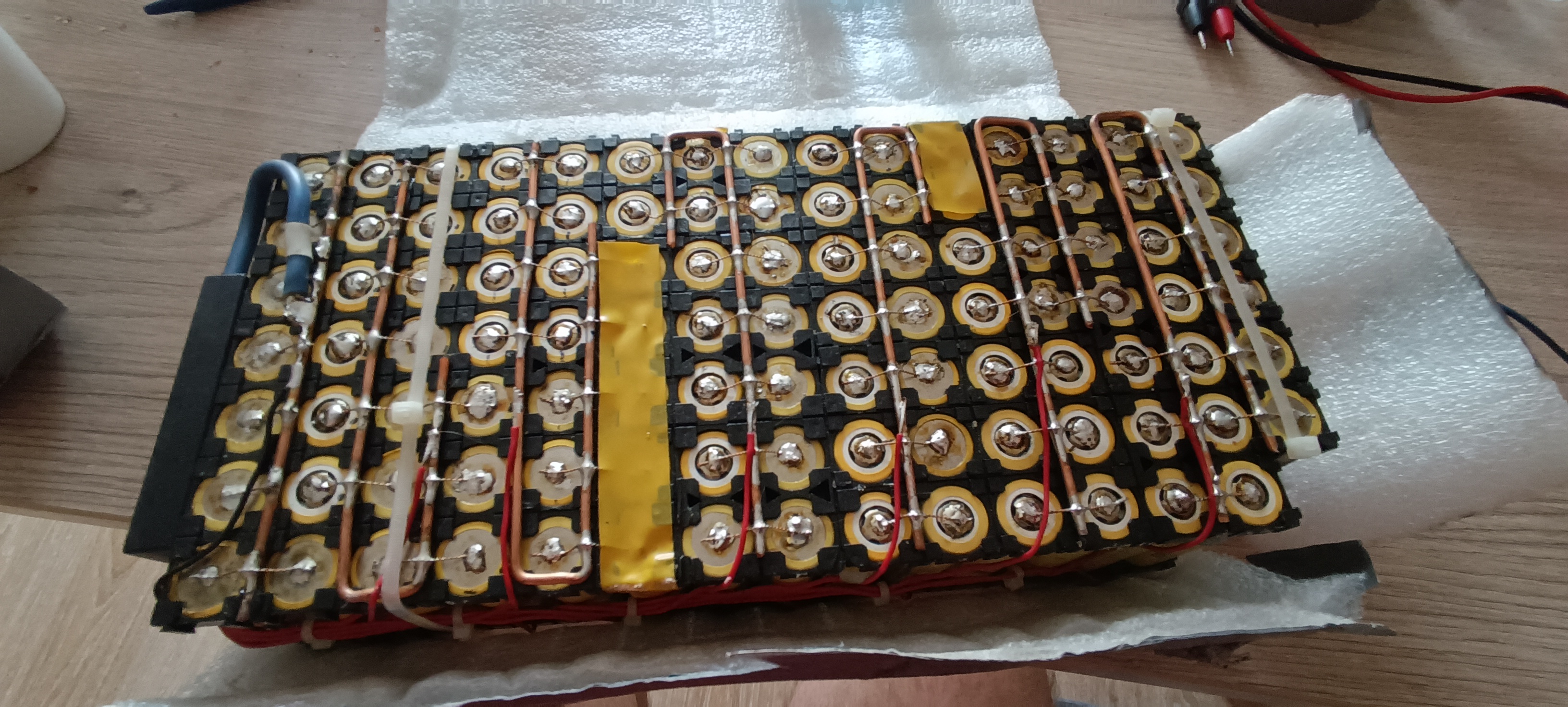 Мелкая зеленуха, которую я для жены собрал. На 36 вольт. Планировал получить 20 А/Ч и взял по 6 в параллель, ибо ёмкость якобы 3,3 Ампера. Но ёмкость оказалась ниже и в итоге получилось где-то 17-18 А/Ч.