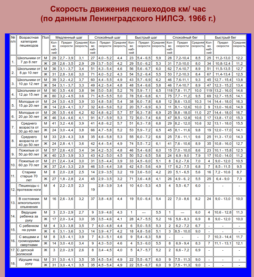 >>1576212 У тебя табличка буквально говорит, что средняя скорость спокойного шага для мужчин 20-40 лет 5.7 км/ч, т.е. километр спокойным шагом - это в среднем 10.5 минут.