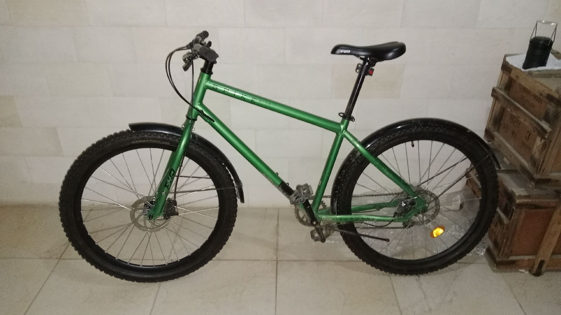 поставил шипованые покрышки 27,5х2.1. осталось дождаться снега и наледи. Как положено у нищебратьев, купил на авито Б/У за 1800 за штуку. Трясся, что придется крылья снять. Напрасно, влезло со свистом