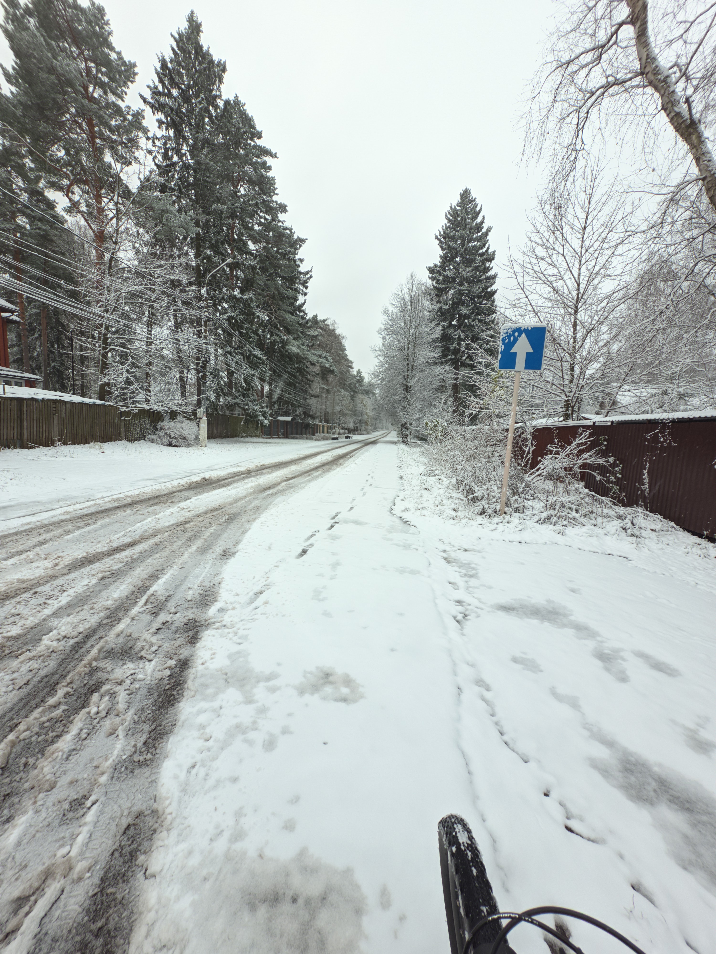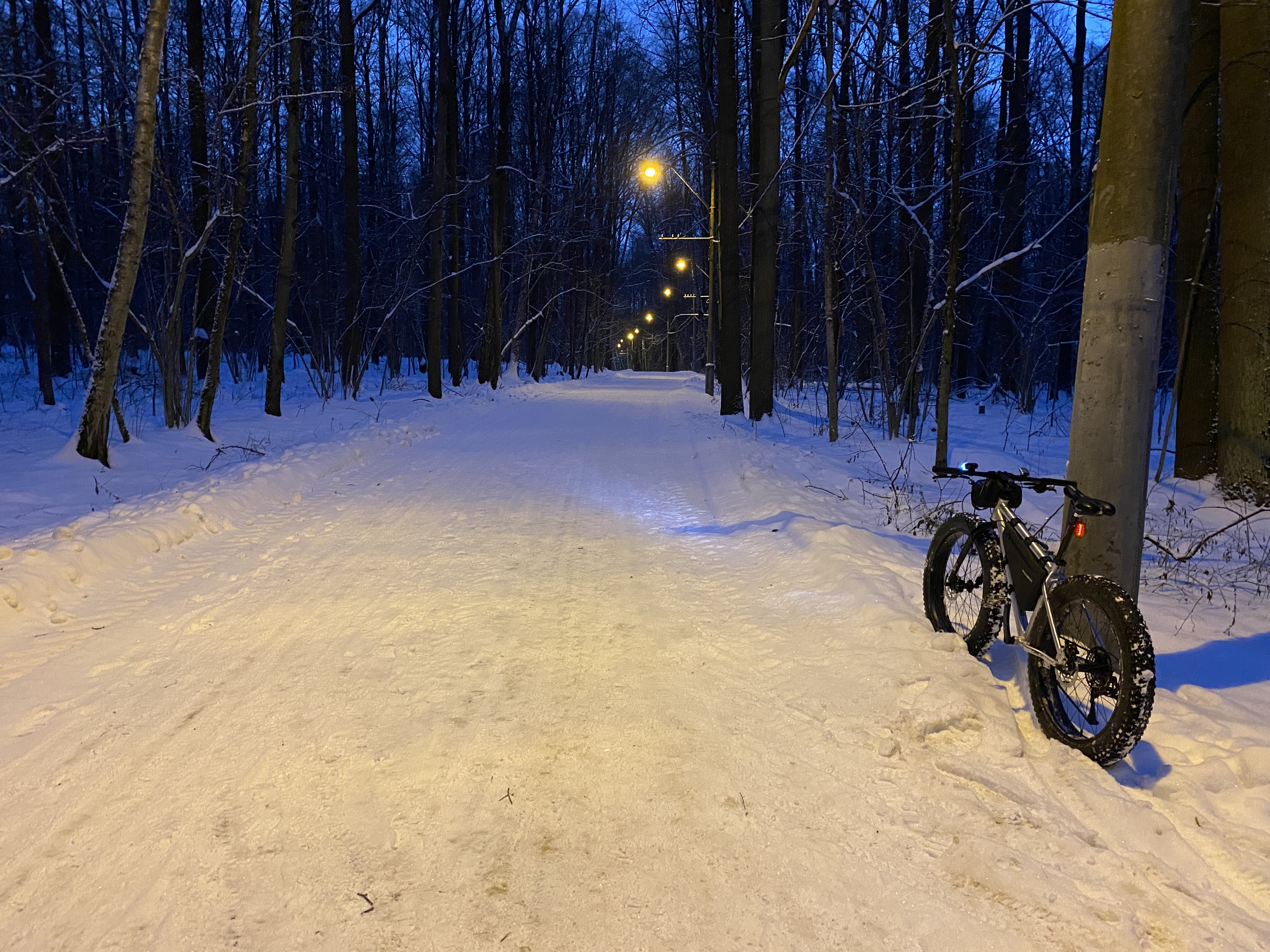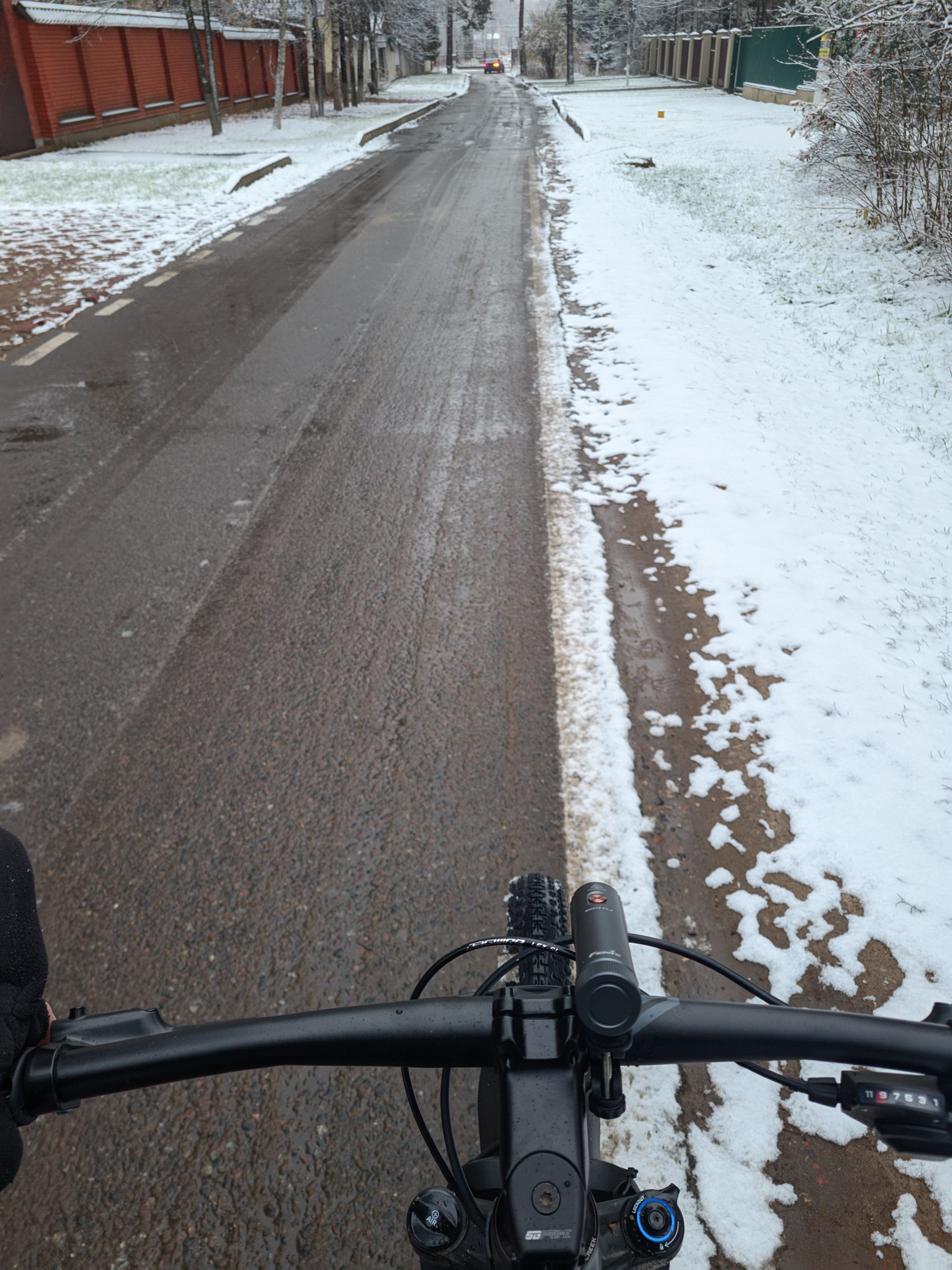 Снег выпал, наконец-то. Пора утепляться. Скатался на другой конец города в Триал за ботами. Снега маму ебал - тот же путь по дороге можно вдвое, если не втрое быстрее проехать, а не тошнить 15-20км/ч по ухабистому снегу на тротуаре, пропуская каждого встречного пешика :( Теперь приходится и задний тормоз как основной юзать - больно уж легко переднее колесо сорвать в занос, но в тёплой одежде хотя бы падать не так больно будет в случае чего :) По пути меня, конечно же, приняли за курьера Яндекс.еды какие-то алкаши у ж/д перехода. Спросили - тёплая ли ещё пицца в сумке 😅 В целом электровелосипед в таком виде и в такую погоду - магнит для взглядов. Засматриваются в основном пацаны и мужики лет за сорок.