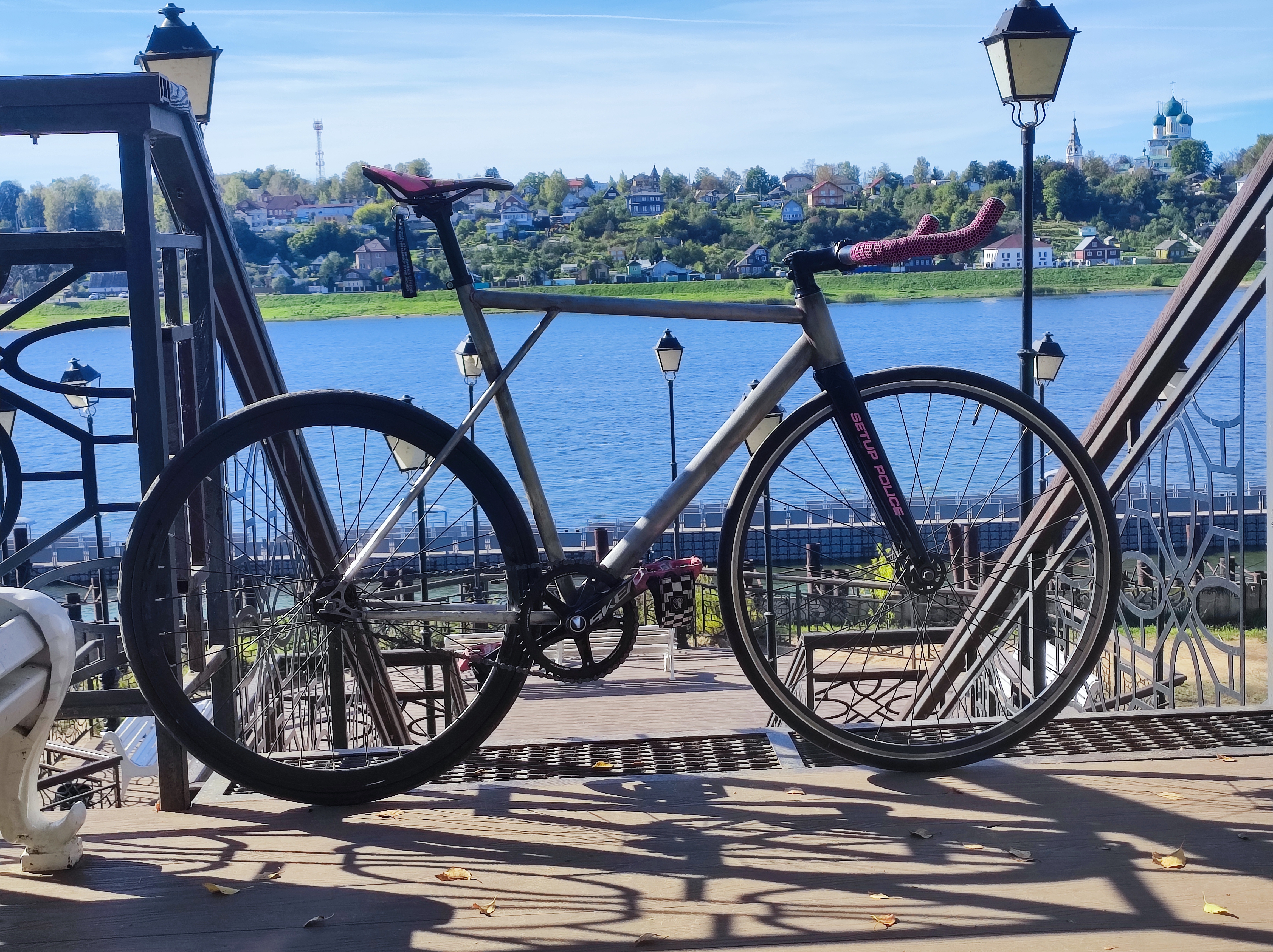Что скажу по велику - самый базовый китай фикс: хромоль рама карбовилка, звëзды 50/16, довольно тяжëлый алю вилсет. Катилось сложно только на продолжительных уклонах более 3% Если есть здесь Ярославские - рекомендовал бы ехать до Тутаева по правобережней стороне. Дорога шире, нет ям и в разы меньше уклонов.