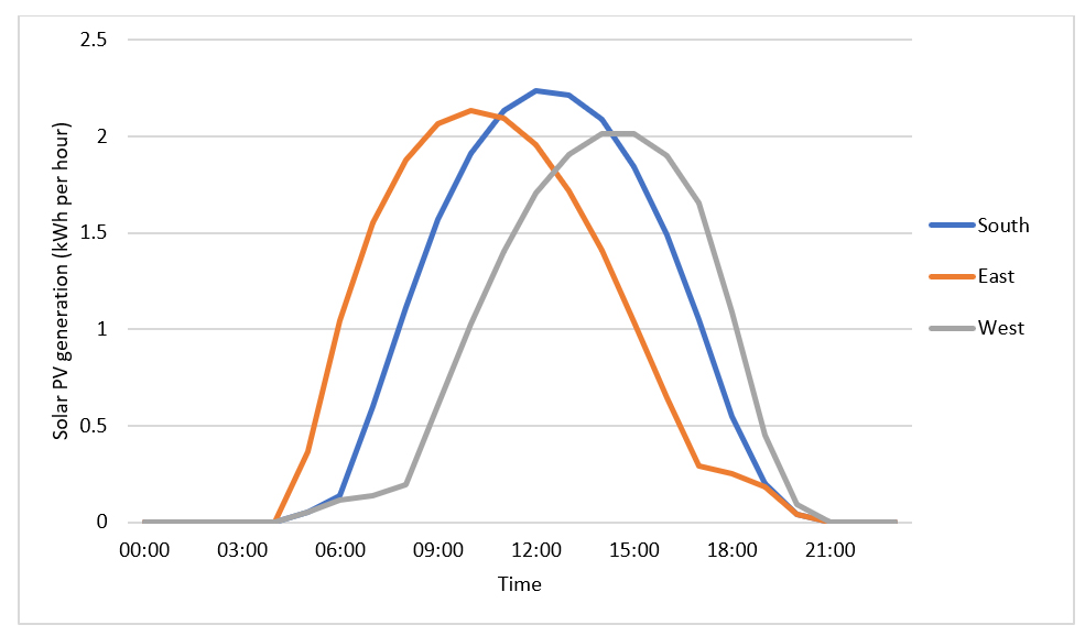 >>1607911 Ты типа технарь? Диплом сам купил или подарили? Попытайся сам понять что изображено на этом твоём графике. График иллюстрирует выработку солнечной энергии (кВтч в час) в течение дня для солнечных панелей, ориентированных на юг, восток и запад.