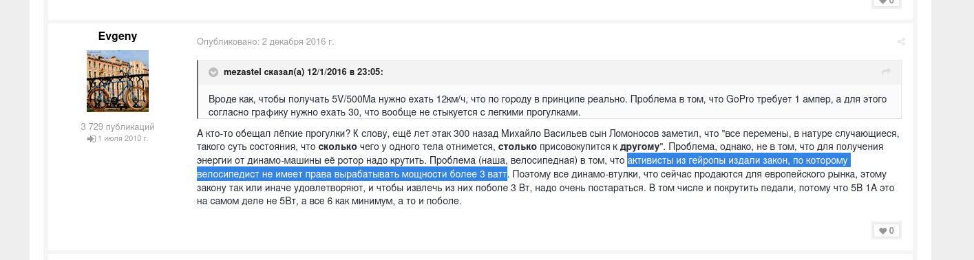 >>1607630 >они жрут усилие при педалировании >они очень, очень слабые >Нормального света с динамкой можешь не ждать Дай угадаю, динамовтулки ты только на картинках в интернете видел? Езжу с динамо-втулкой 12 лет. Много раз вывозил в своем свете группу ночью из лесов/ебеней, когда у всех остальных фары уже сели. Я любитель ездить по ночам в ебенях. Ведро лития это хорошо, но его часто не хватает.
