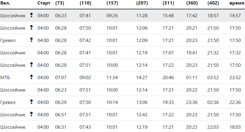 >>1601651 >никто со средней 30 бреветы не ездит. Дохуя народа проезжают двухсотку менее, чем за 7 часов. Я за 8 проезжаю, с учётом отдыха на развороте. И всегда есть пачка, которая проезжает за 6 часов.