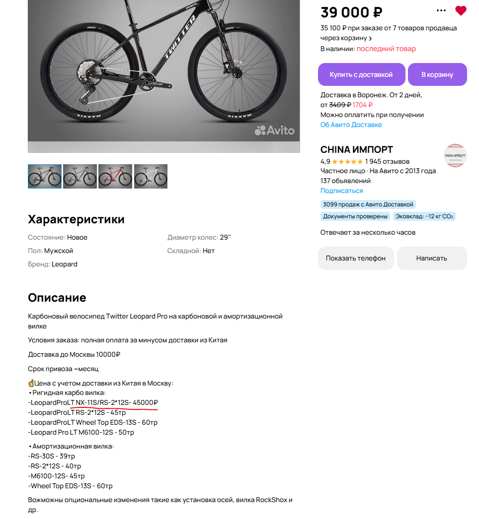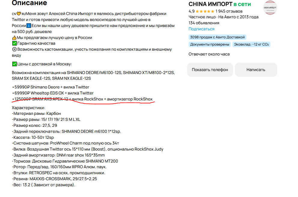 ХЗ что там за ссылку на ютуб ты принёс, ютуб ничо не продаёт. У моего твиттера вилтоп за 40, фреймсет пускай оценим в 30, карбоновый вилсет при большом желании можно найти за 20. Получается уже 90, без чейнсета, системы, палок, сборки, допов и покрых. Да, с твитером всё приемлемо. Пока из косяков сдохщие собачки и треск каретки. Первого можно избежать если собирать хорошо, второе пока не проявило себя критически. Проехал примерно 3 тыщи.