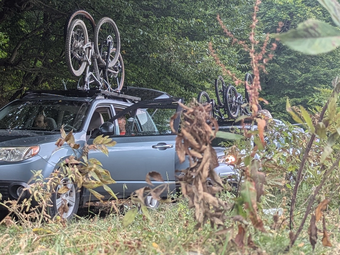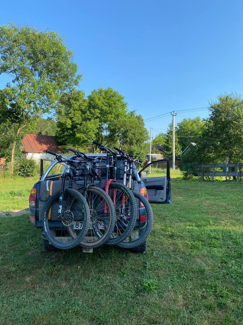 Просто покупаешь металлический профиль, мужики в гараже тебе варят из него багажник за пузырь, красишь из балона и цепляешь его на рейлы. Велики на стяжки и поехал. 120 по трассе, серпантины, горные дороги - все норм.