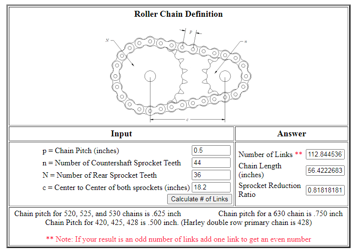 >>1625056 >>1625075 >>1625096 Прикольная штука. Не знал что есть такие калькуляторы. Нашел один, правда для мотоциклов. Но я знаю сколько звеньев нужно прибавить для правильного результата. Получилось 116 звеньев нужно, не 118.