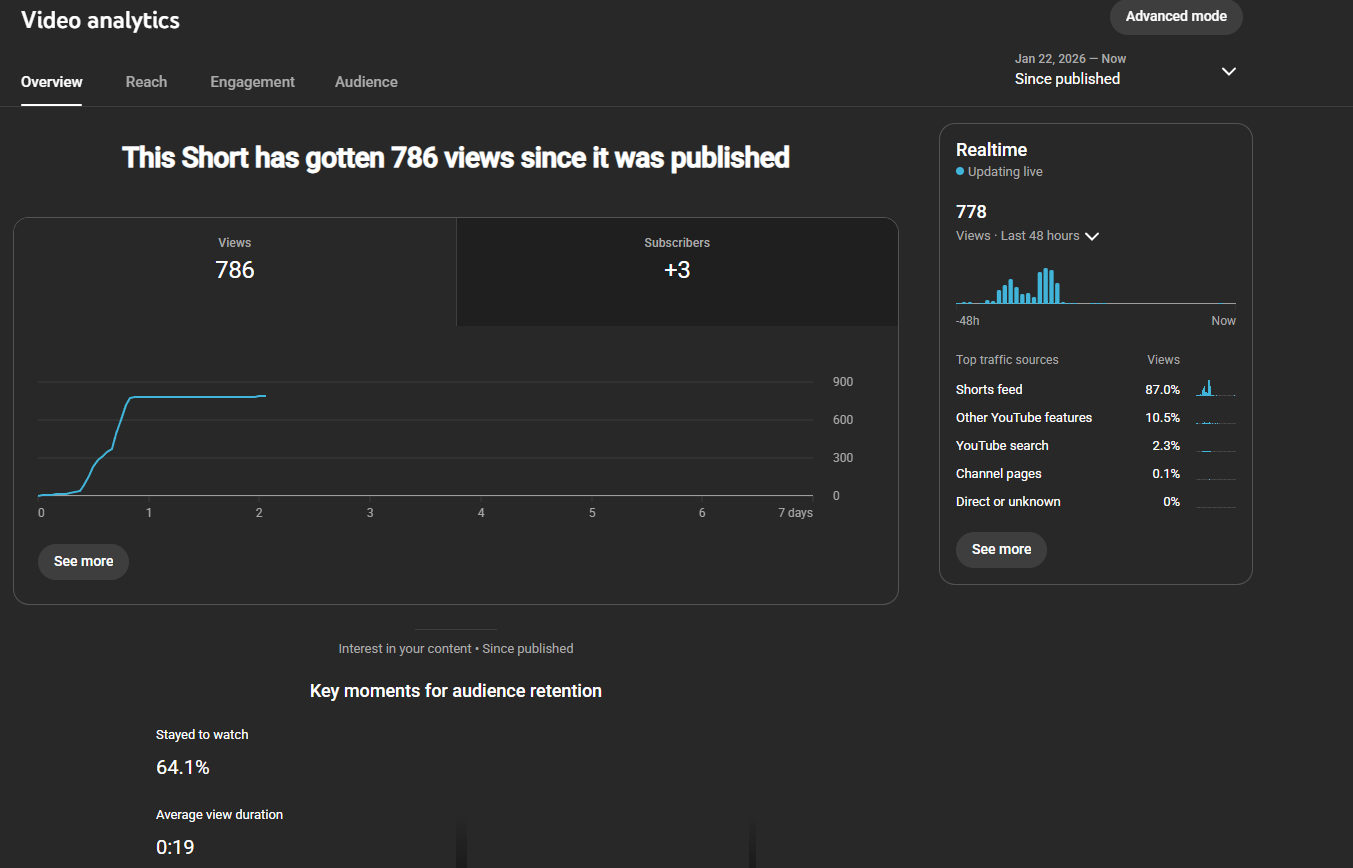 Да как эти ваши шорты работают? У меня мелкий канал, музыку выкладываю. До этого пара шортсов набирали по 1к. Позавчера выложил новый, он хорошо начал лететь относительно старых, набрал 16 лайков и 4 коммента, но встал на отметке 768 просмотров - хотя по всем метрикам шёл лучше прежних двух. Обида ебаная
