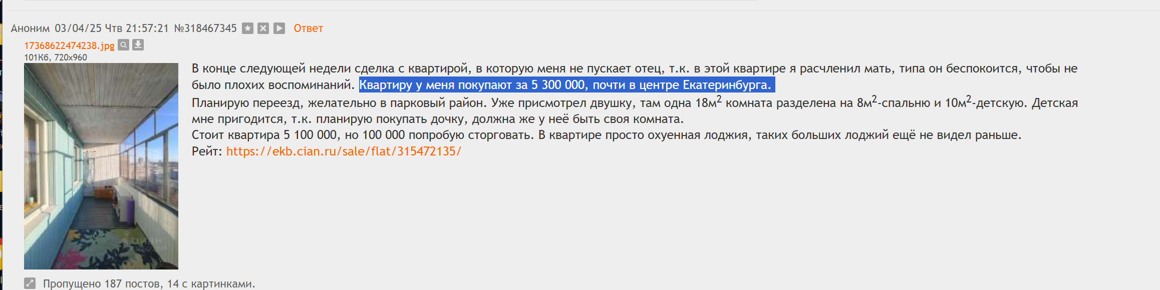 На 5,1млн буду искать другую квартиру. Вариантов с адекватным ремонтом мало. Но всегда держу вариант с отсутствием ремонта, но на 900 000 рублей дешевле. Ремонт мне папа поможет сделать, если что. Он хоть и криворукий, но всё, кроме установки дверей и наклейки обоев ему даётся неплохо. Ну и кухню собирать я ему больше не доверю. Вот такие варианты присматриваю: https://ekb.cian.ru/sale/flat/315472135/ Хороший район, самый лучший среди спальных районов города. Большая однокомнатная квартира была переделана в двухкомнатную. Две комнаты очень маленькие, но мне норм. Плюс - есть детская. https://ekb.cian.ru/sale/flat/314770307/ Хороший район, я в этом районе жил раньше. Большой метраж. Две отдельные комнаты, кладовка. Минусы: старпёрский ремонт и мебель с закосом под красное дерево, на исправление у меня сразу денег не будет, поэтому придётся терпеть. https://www.avito.ru/ekaterinburg/kvartiry/2-k._kvartira_441_m_55_et._7201362129 Плюсы: знакомый район, сейчас тут неподалёку живу. Низкая цена - меньше на 1 миллион рублей. На этот сэкономленный миллион можно сделать отличный ремонт, и обставить мебелью и техникой. Но ремонт требуется капитальный, включая замену окон. Пока писал пост, пришла скидка от продавца на это объявление: https://www.avito.ru/ekaterinburg/kvartiry/2-k._kvartira_397_m_44_et._4634961541 Новая цена - 4 350 000. Хороший район, близко к центру. Не надо менять окна. Но надо менять всё остальное. Очень нравится этот вариант. Но, если выберу, попробую сторговать ещё 50 000. https://www.avito.ru/ekaterinburg/kvartiry/2-k._kvartira_41_m_45_et._4572798820 Вариант хорош тем, что в квартире не грязно, но сделано достаточно безвкусно и по ремонту, и по мебели. Если куплю её, то денег на ремонт и мебель у меня не останется, придётся терпеть. Ещё минус в том, что окна выходят на самую оживлённую улицу города, за окном трамвайные пути. Плюсы: расположение дома. До метро 3 минуты ходьбы (это не на Авито написано, я раньше жил в 100 метрах от этого дома, и лично засекал сколько до метро идти). До центра можно пешком дойти. Тренажёрный зал БрайтФит прямо в доме, что удобно, ибо у меня оплачен абонемент до конца лета. Но нет, наверное, брать эту квартиру не буду. https://www.avito.ru/ekaterinburg/kvartiry/2-k._kvartira_436_m_55_et._4670406396 Плюсы: более менее чисто, цена, знакомый район, наличие детской, метраж. Минусы: вход в одну комнату из другой.