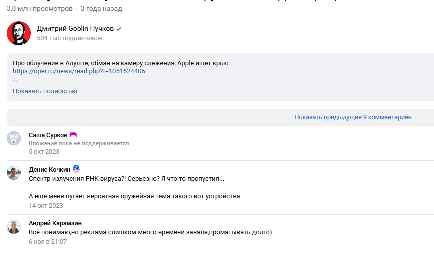 >>2308095 В вк просмотр - это показ. Если в ленте кому-то видео гоблача вылезло, то это пойдет в просмотр, даже если юзер по нему не кликал. Эти просмотры надо делить где-то на 20, чтобы получить примерную реальную цифру